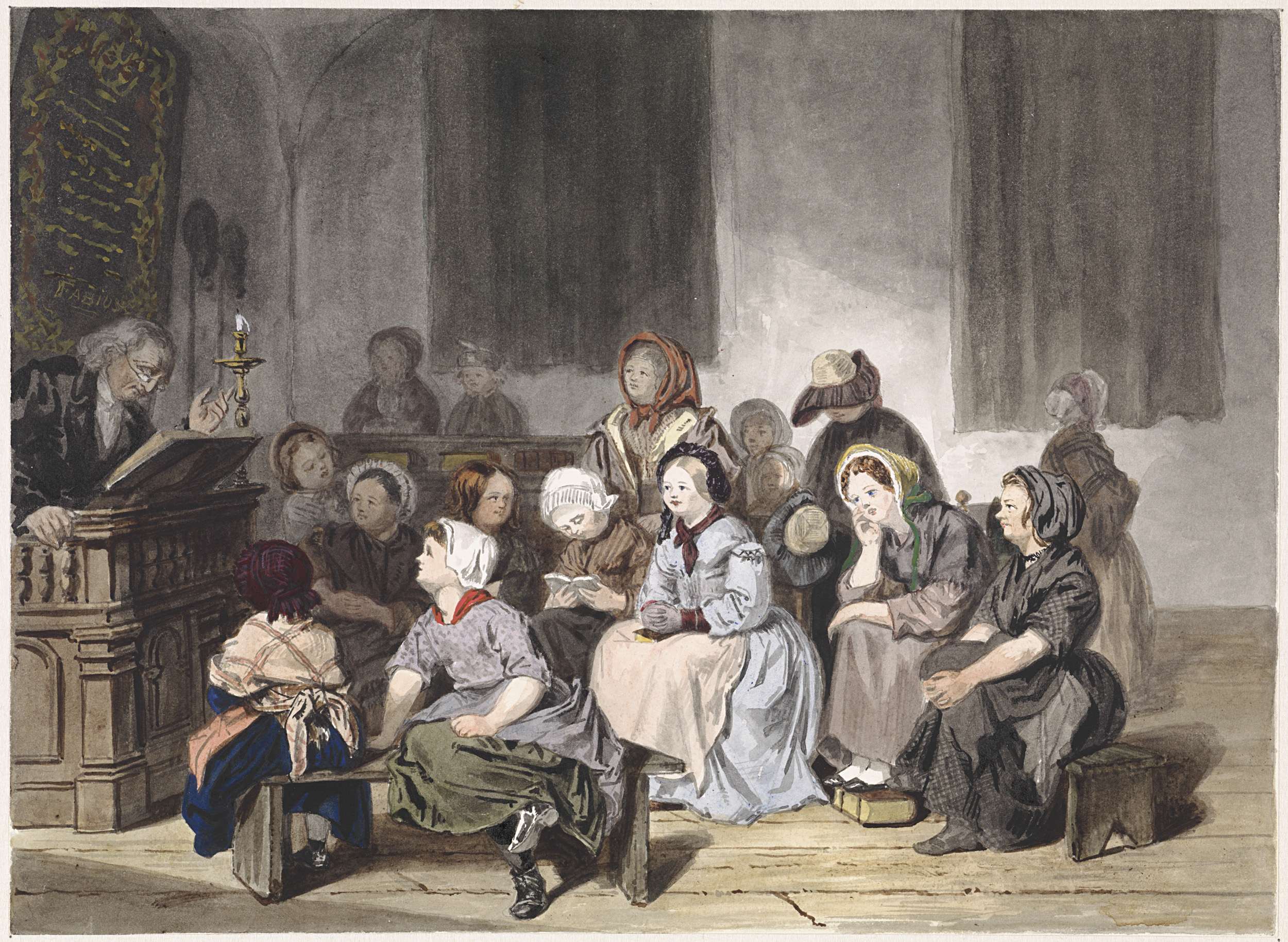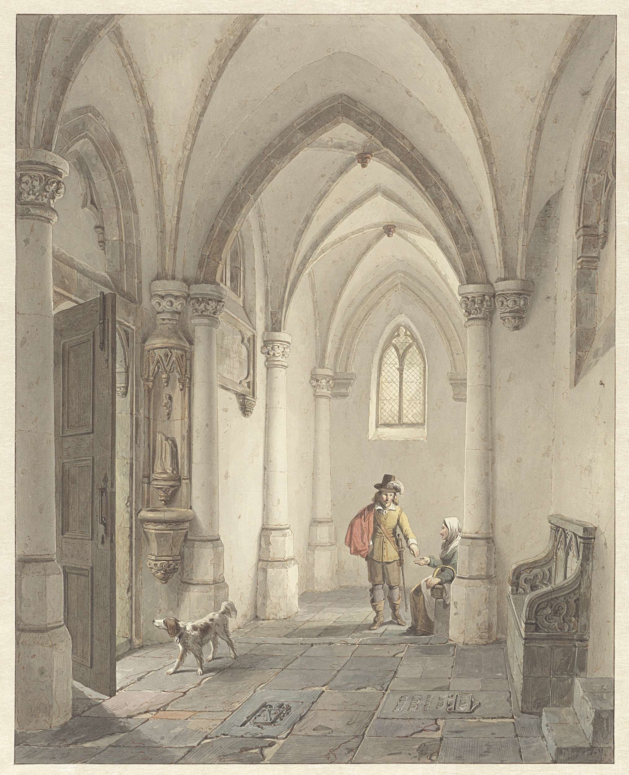 Kerkinterieur met man die bedelaarster een aalmoes g...