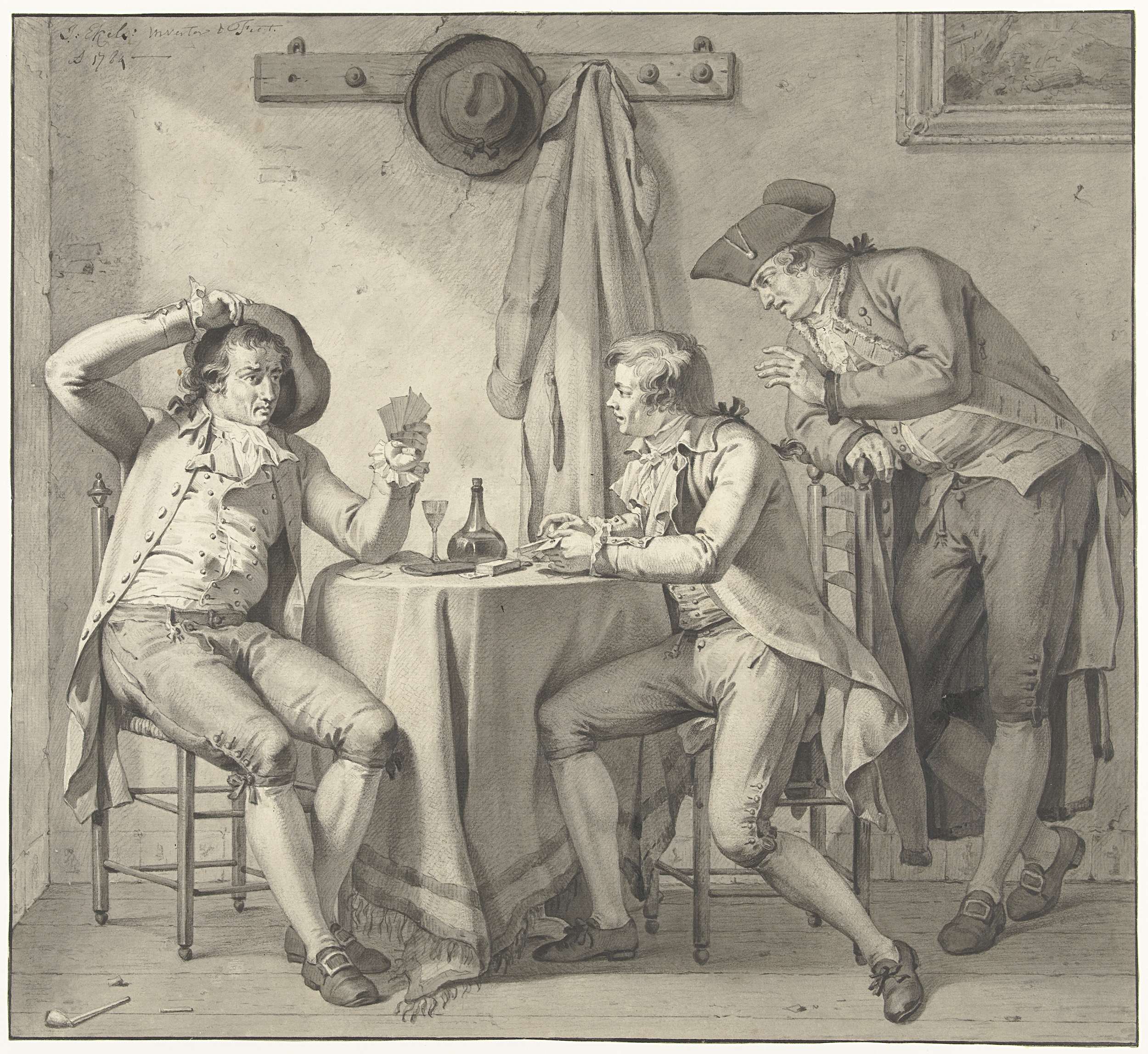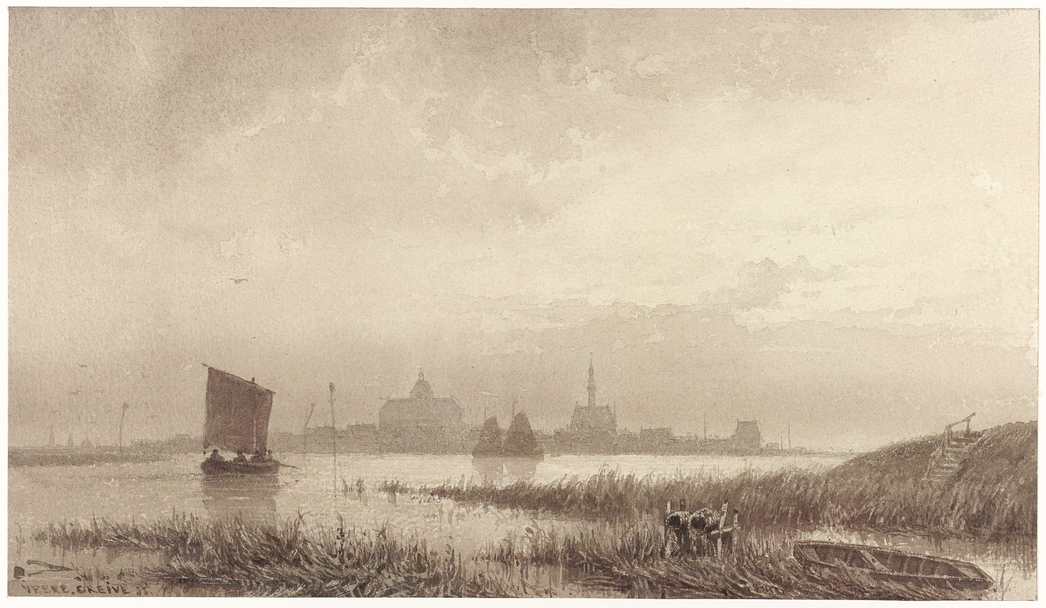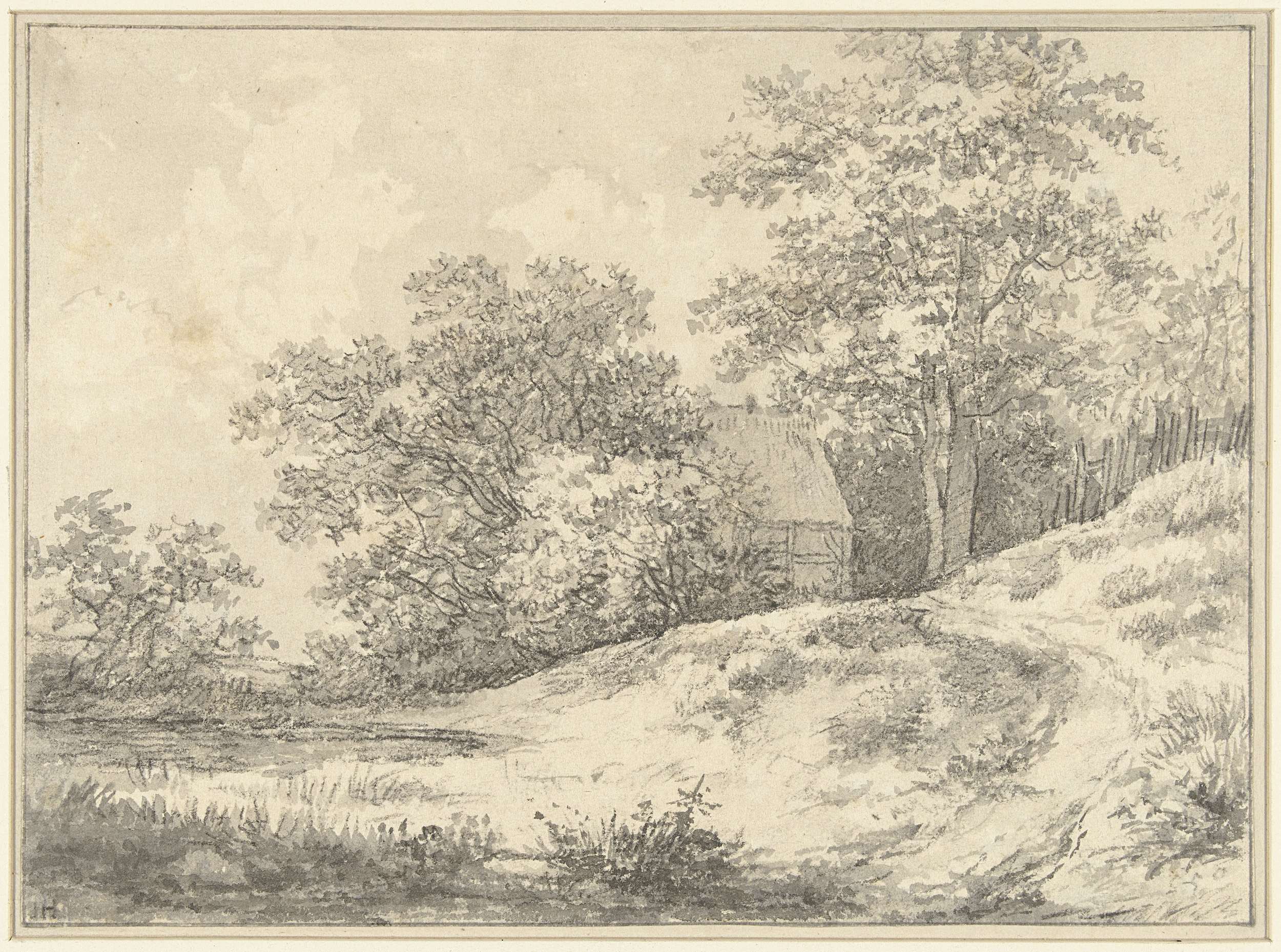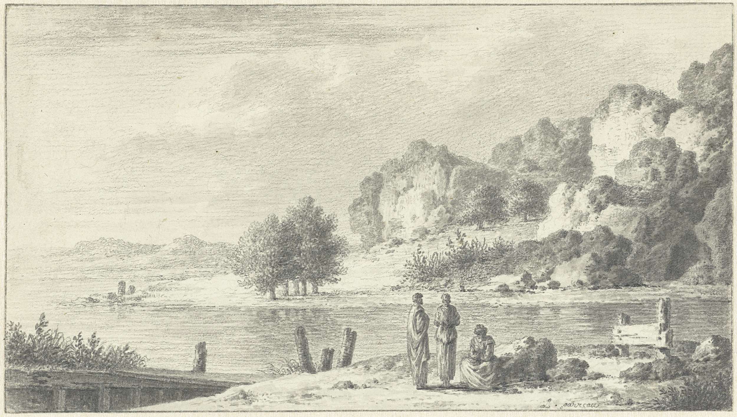 Landschap met huis voor ruïne en op de voorgrond twe...