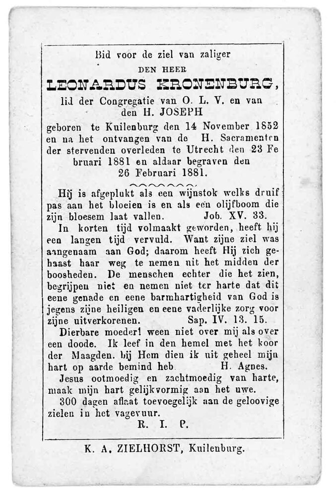 bidprent voor Leonardus Kronenburg. Geboren 14-11-18...