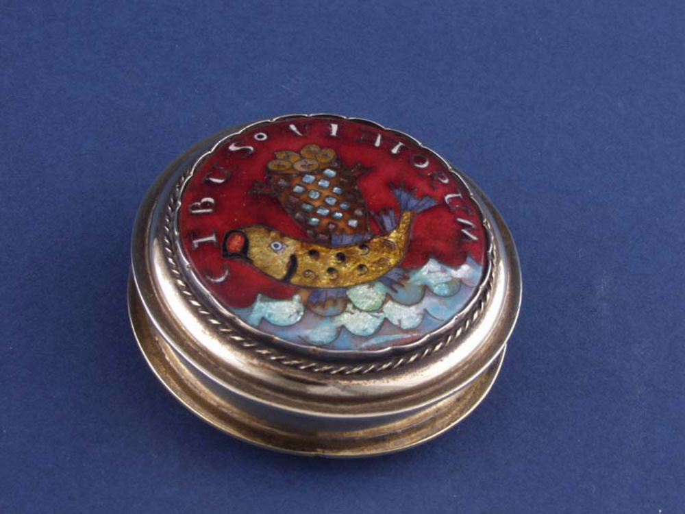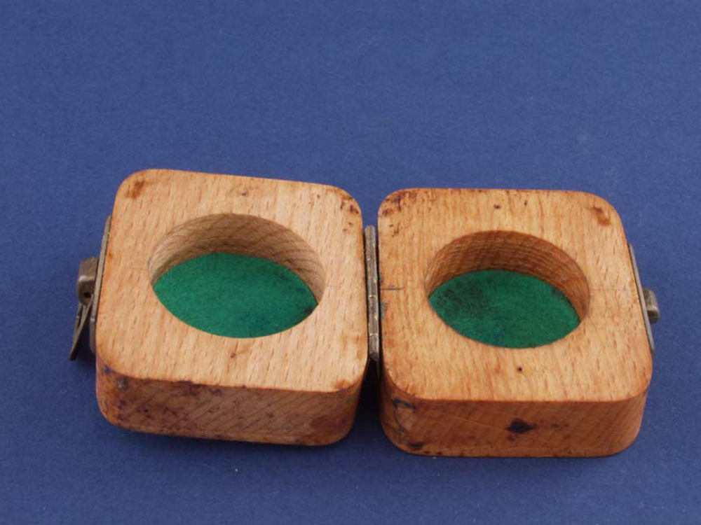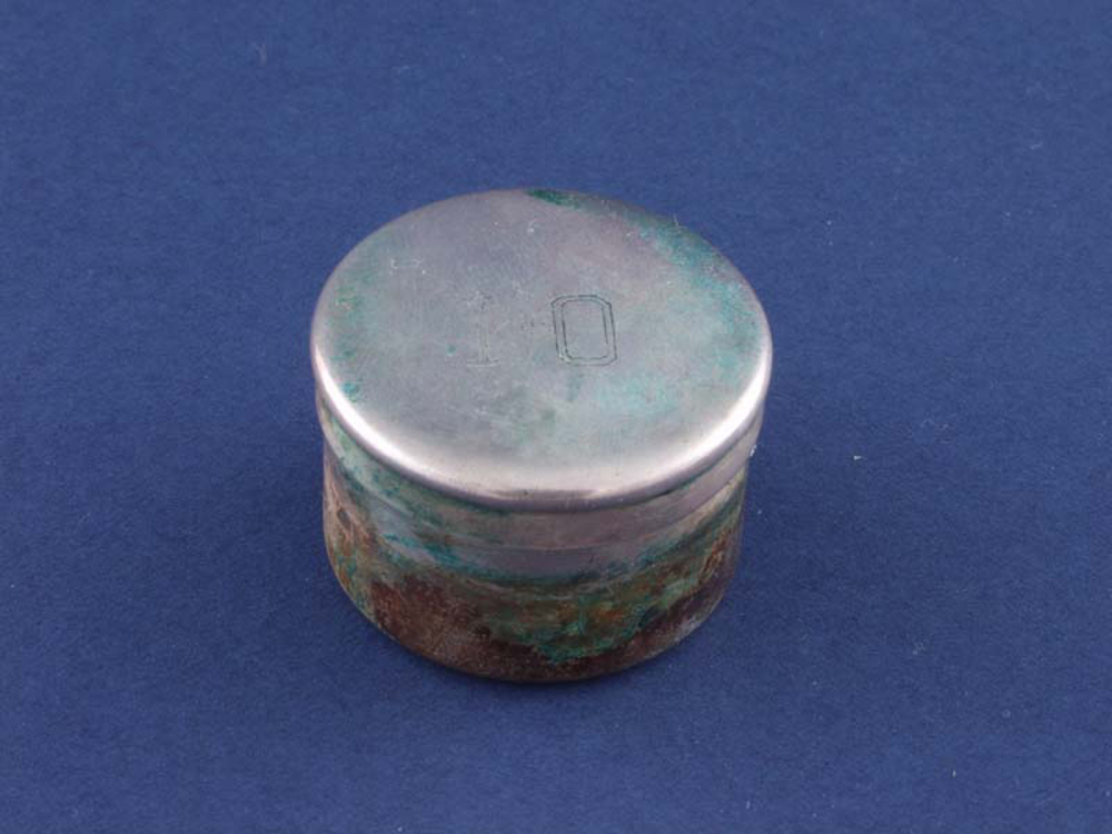 Doosje van hout met daarin een potje van zilver met ...