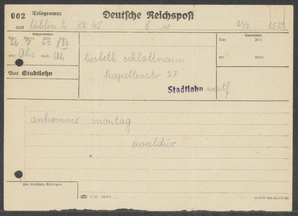 Telegram aan Elisabeth 25-07-1942 (Duitstalig)