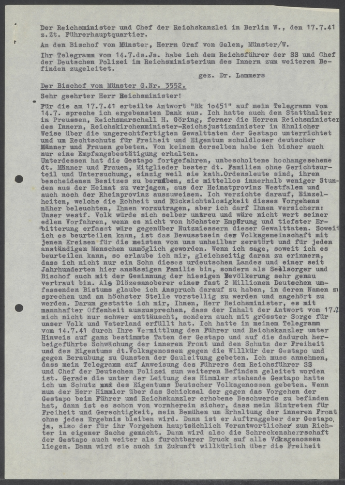 Protestbrief van de Bisschop van Münster m.b.t. zorg...