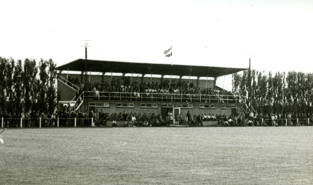 Zwart-wit foto van de opening van het sportveld in A...