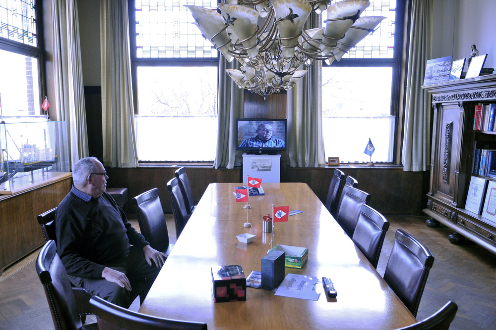 Digitale kleurenfoto van de vergadertafel met kroonl...