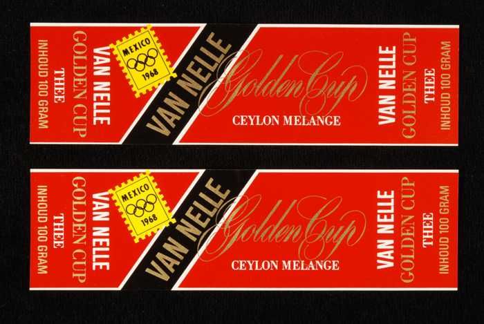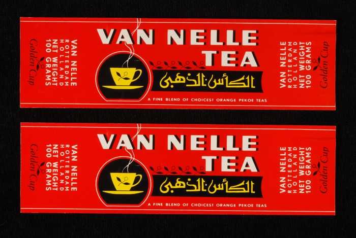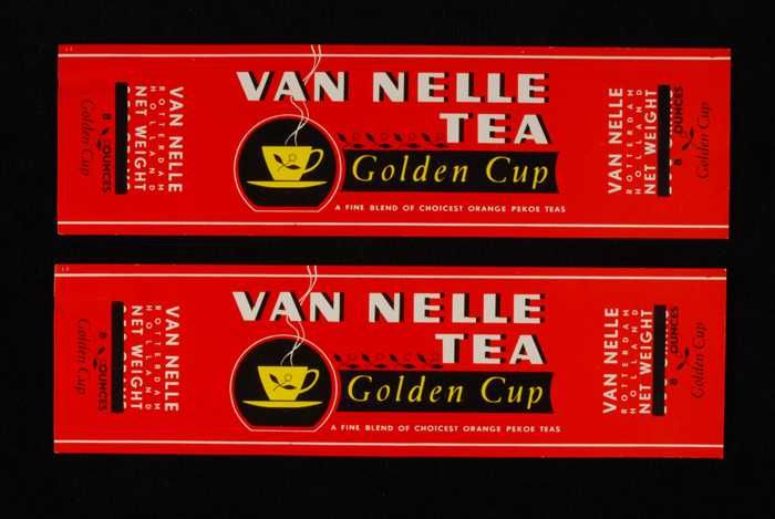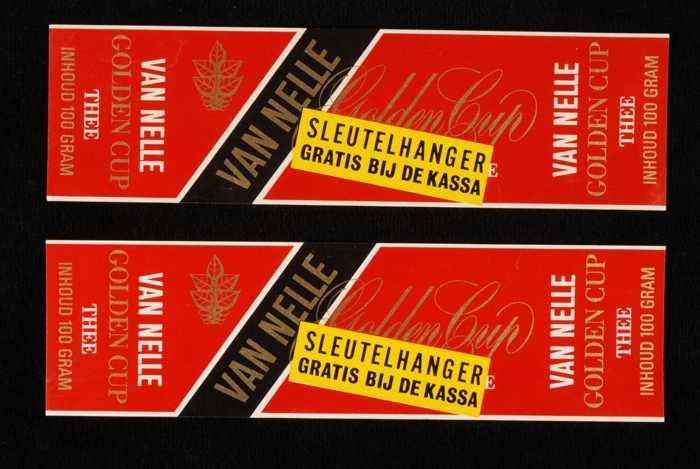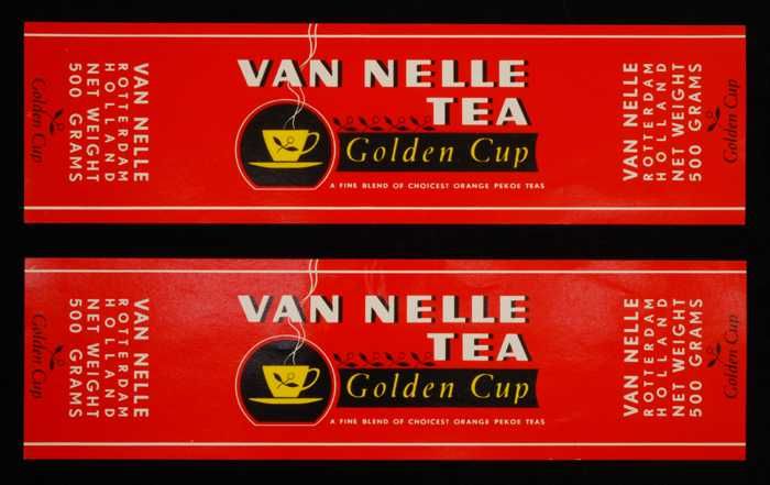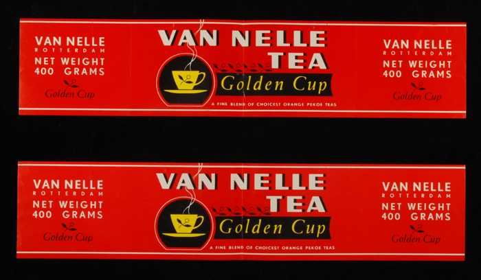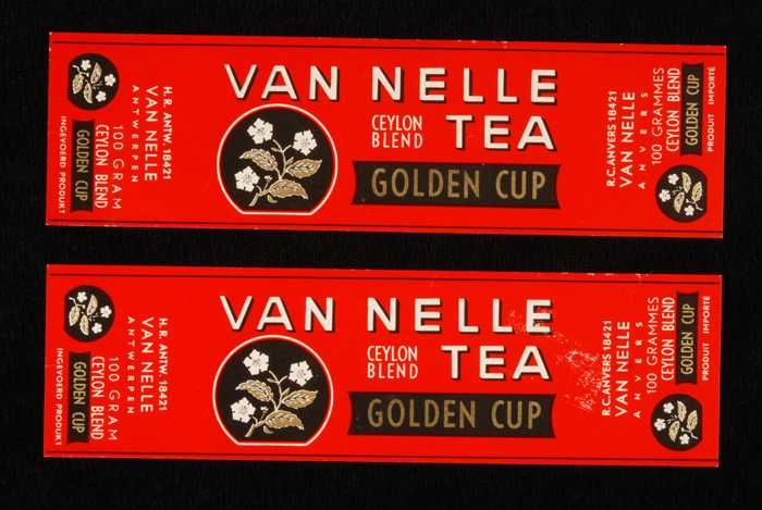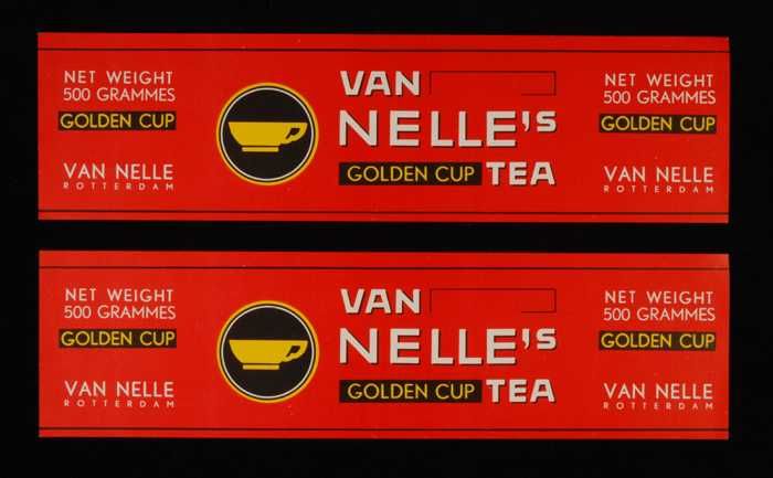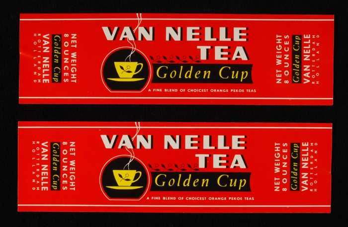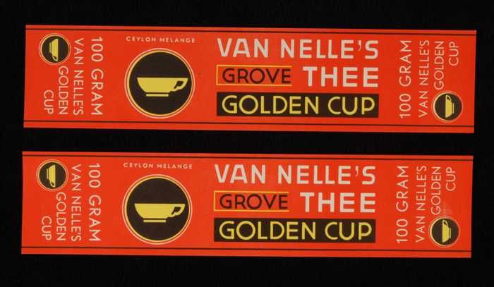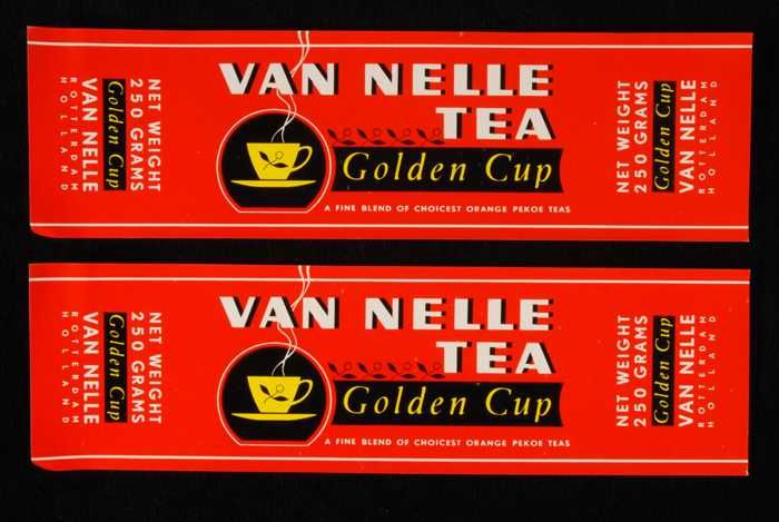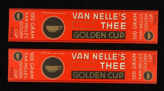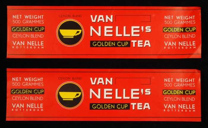 Twee rode labels VAN NELLE'S GOLDEN CUP THEE, grove ...