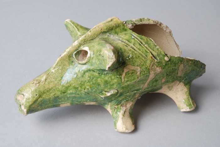 Fragment van aardewerk spaarvarken, grijze scherf, g...