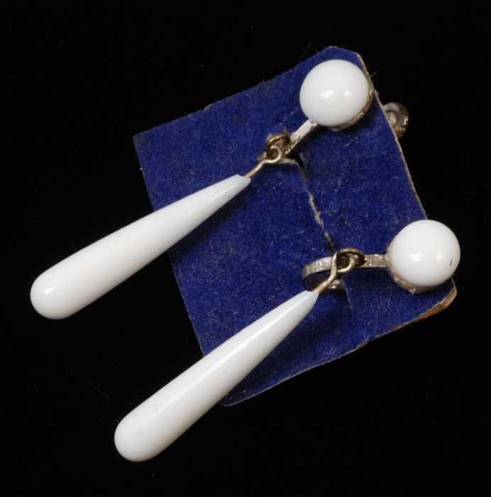 Paar oorbellen, clip met hanger van wit glas aan gou...