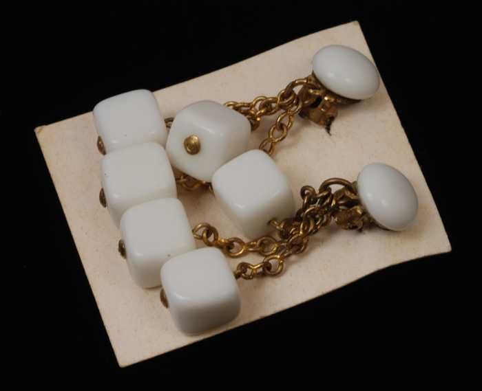 Paar oorbellen, clip met drie kubussen van wit glas ...