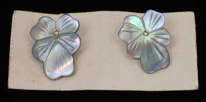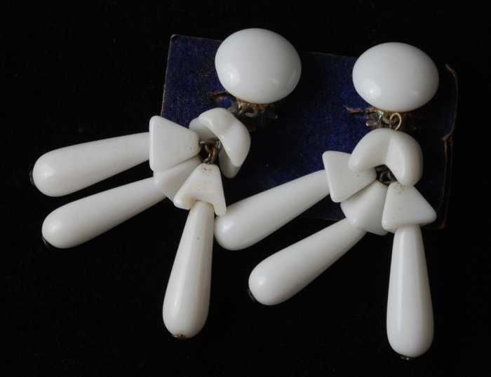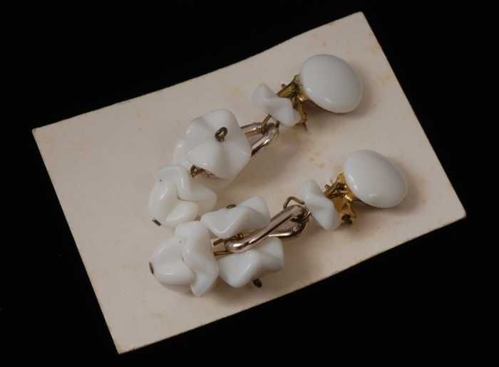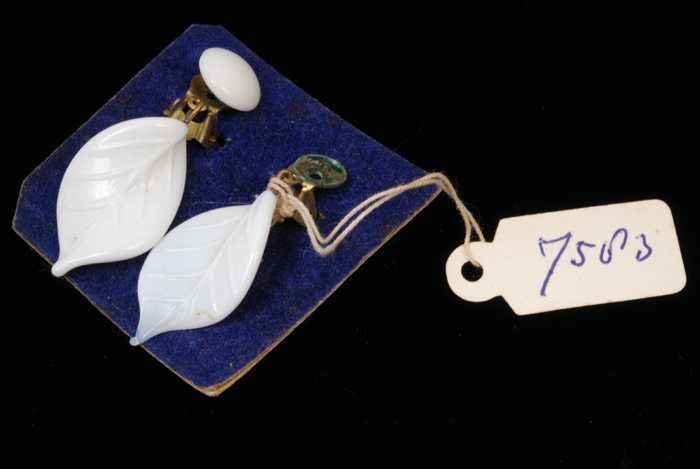Paar oorbellen, clip met bladvorm van wit glas, op b...
