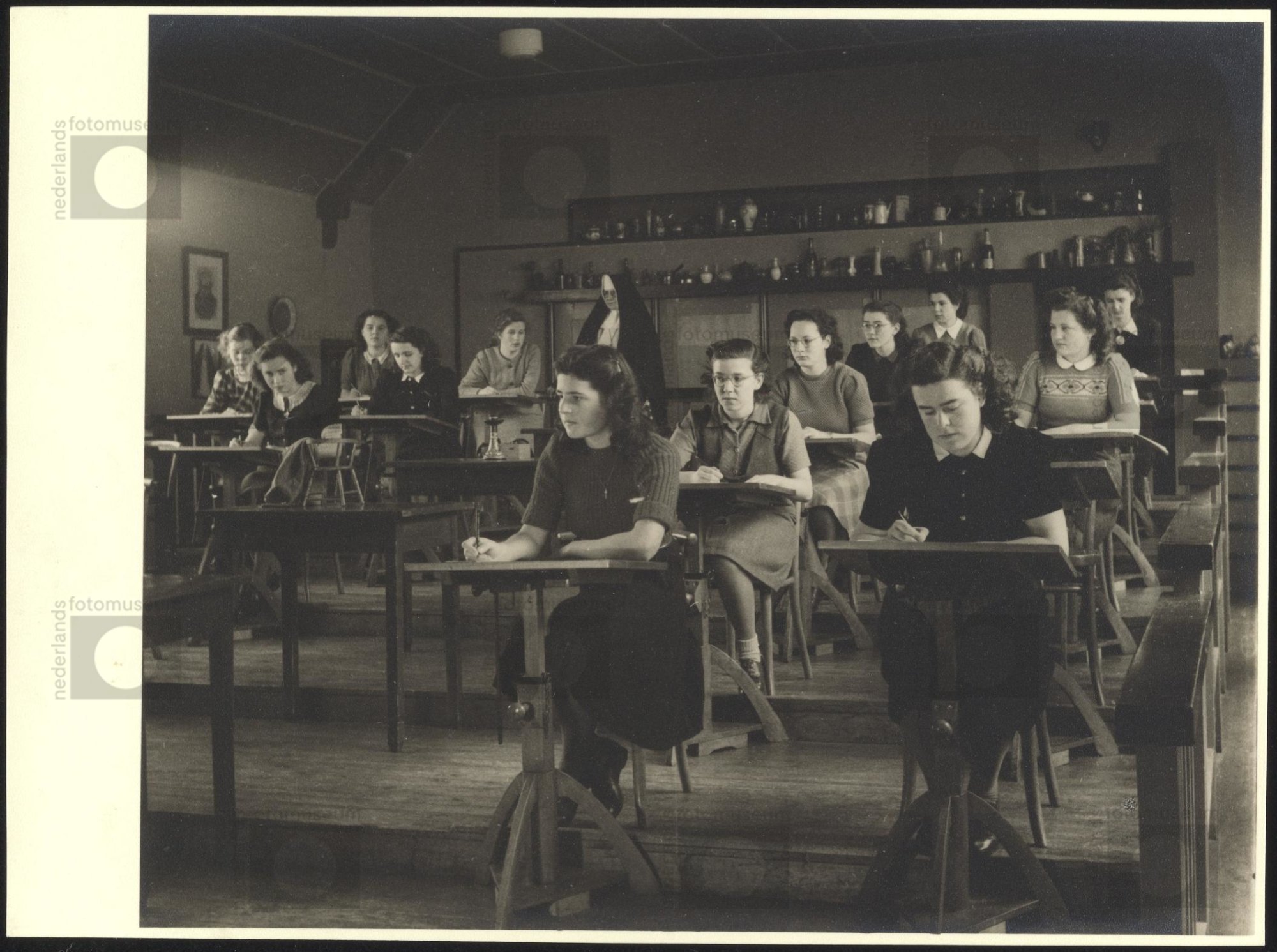 klas met leerlingen onder begeleiding van non, vermo...