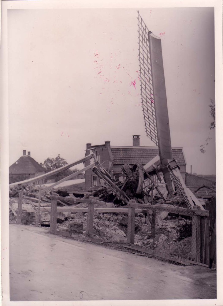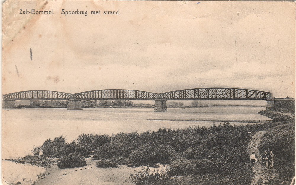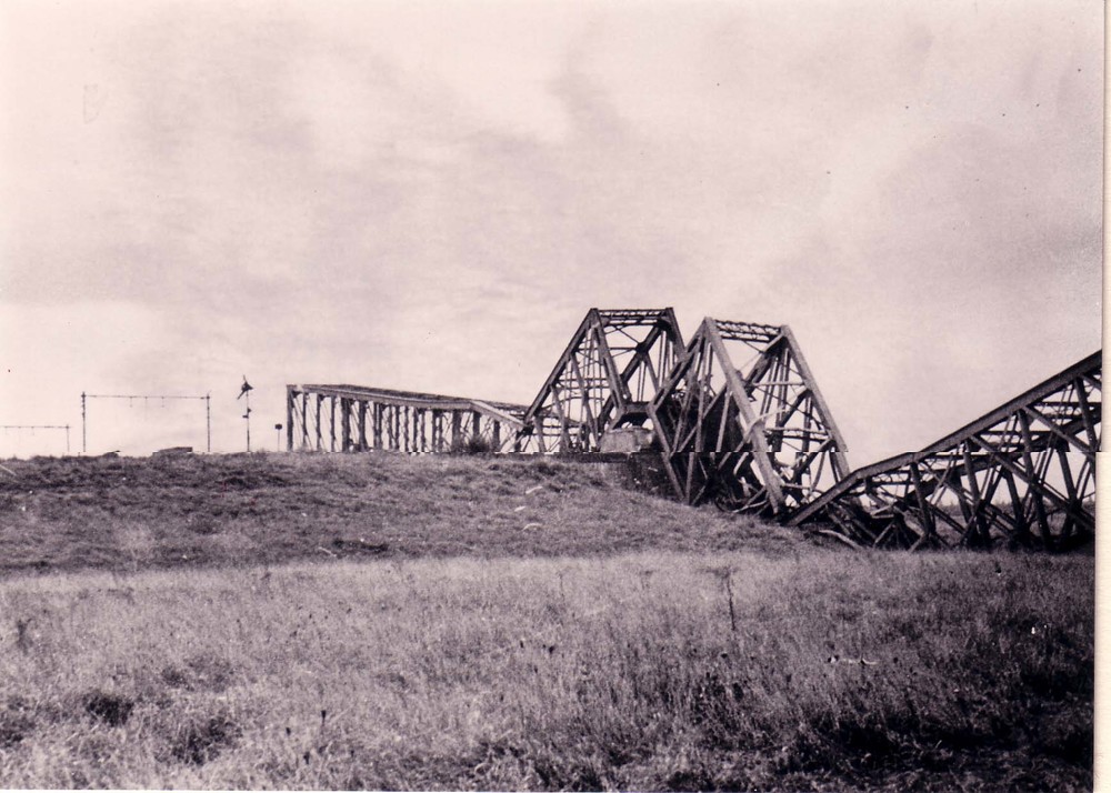 Verwoeste spoorbrug bij Hedel.