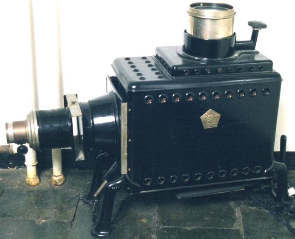 projector. Groot ijzeren model op vier gebogen poten...