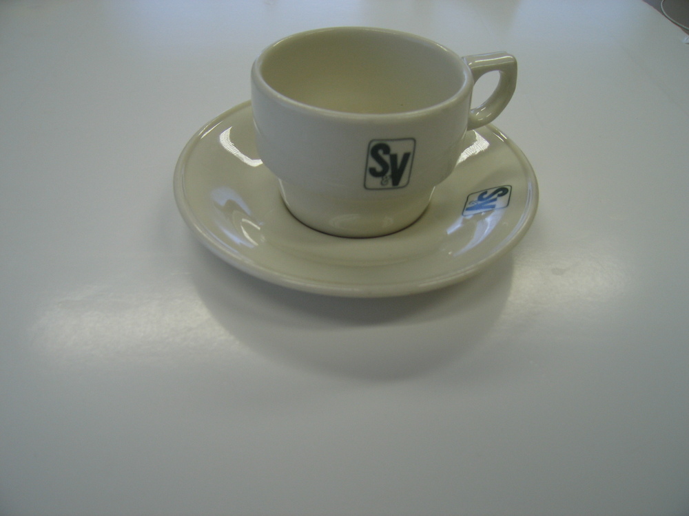 Kop en schotel met het logo van Sinclair & Valentine...