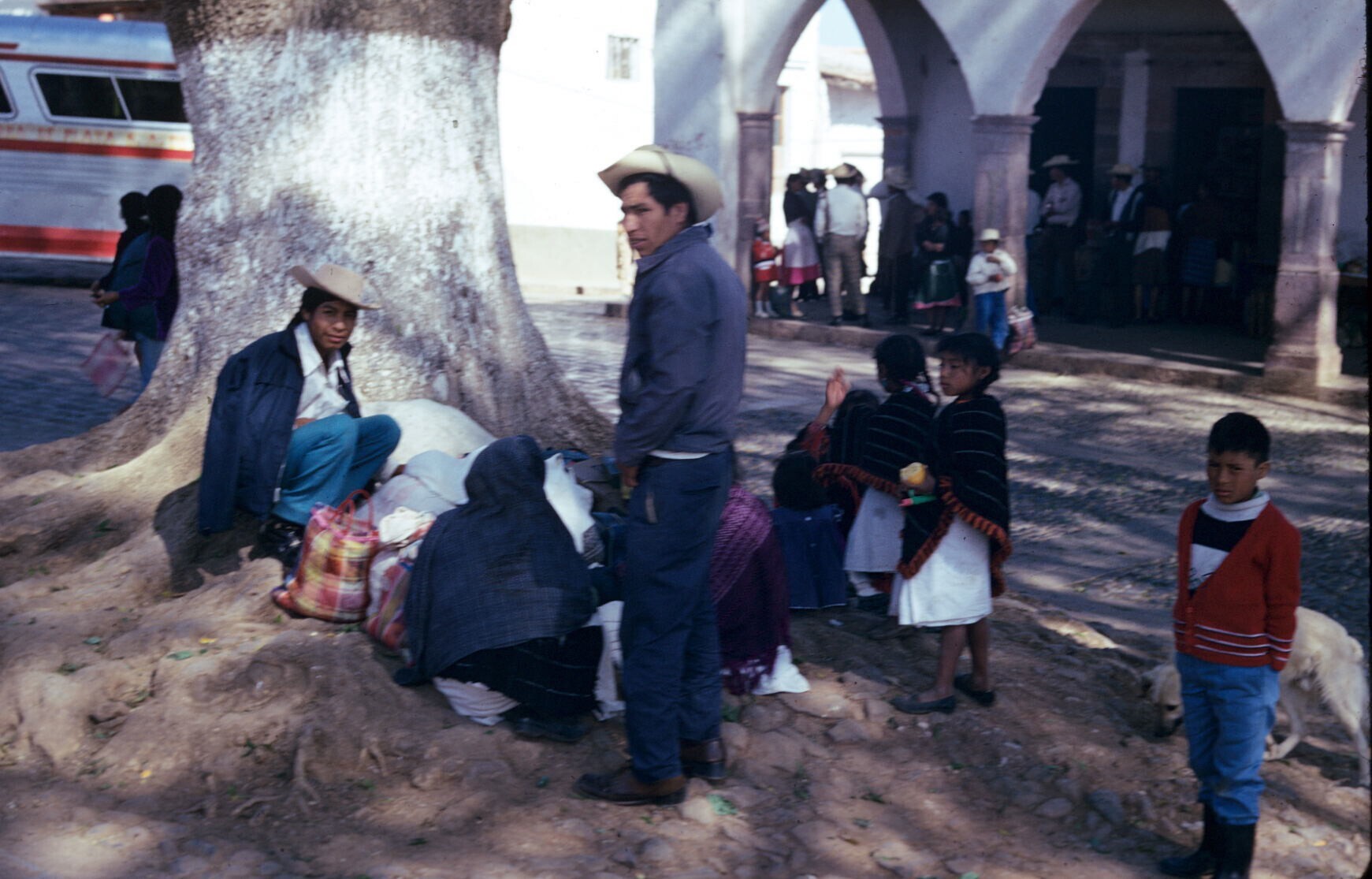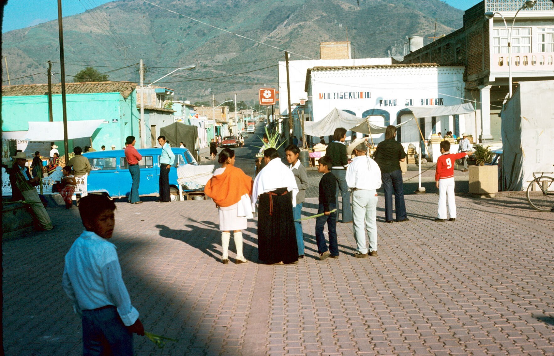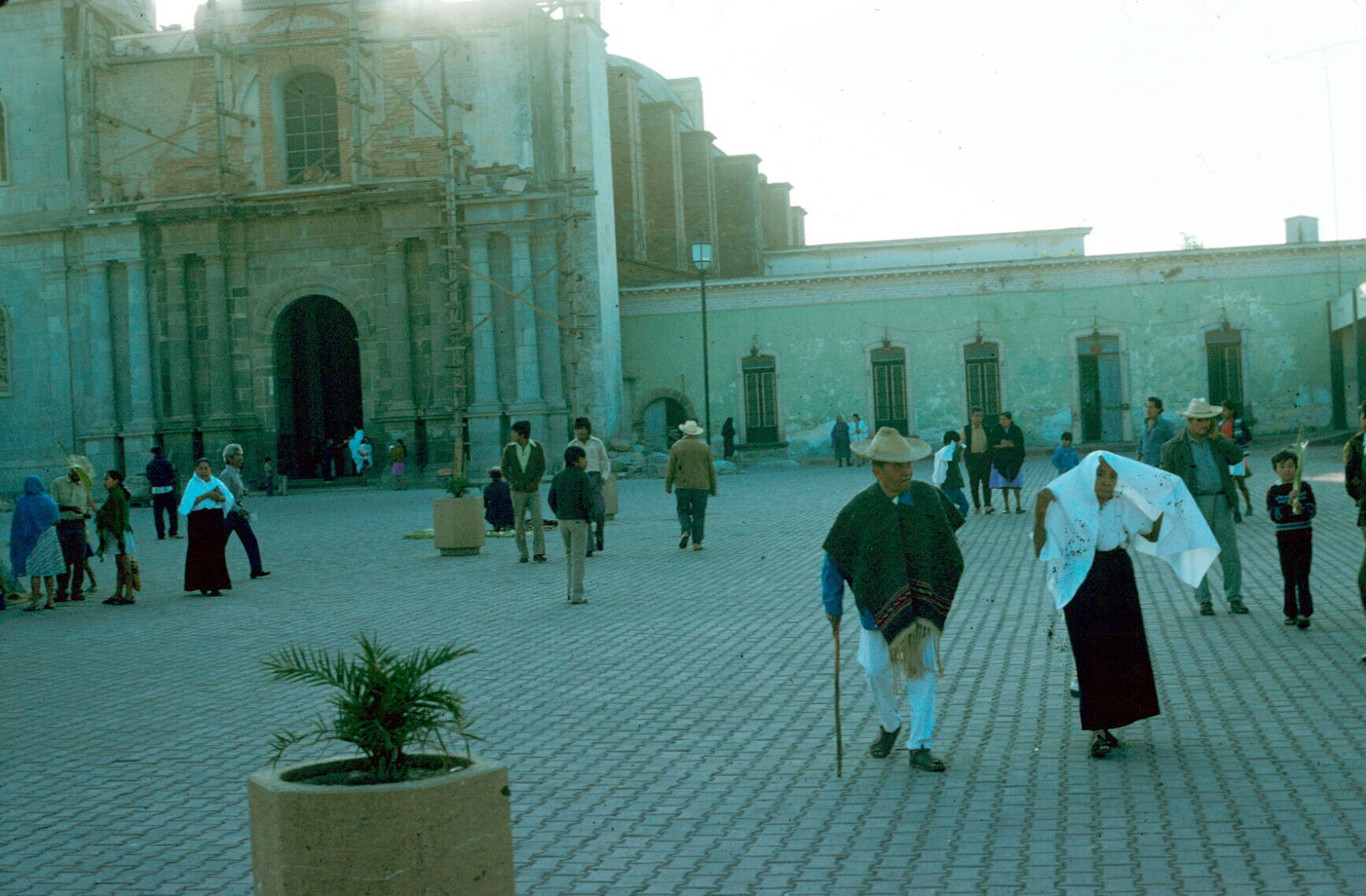 plein voor kerk: vrouw met rebozo, man met jorongo (...