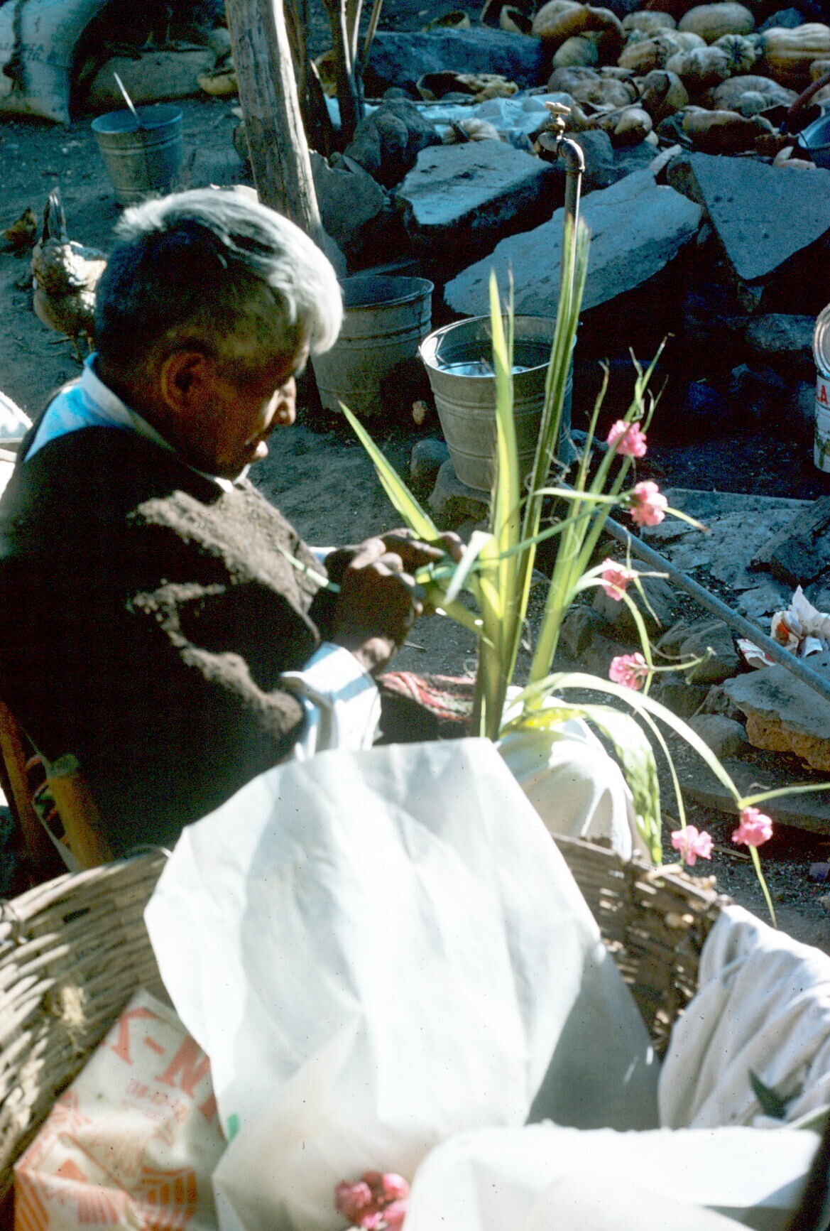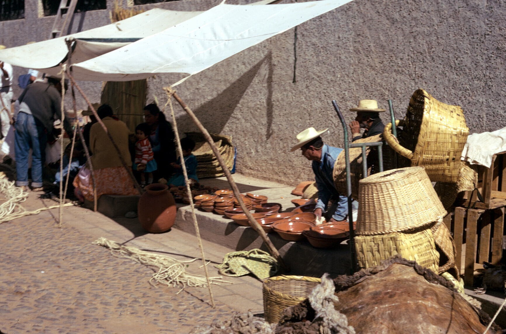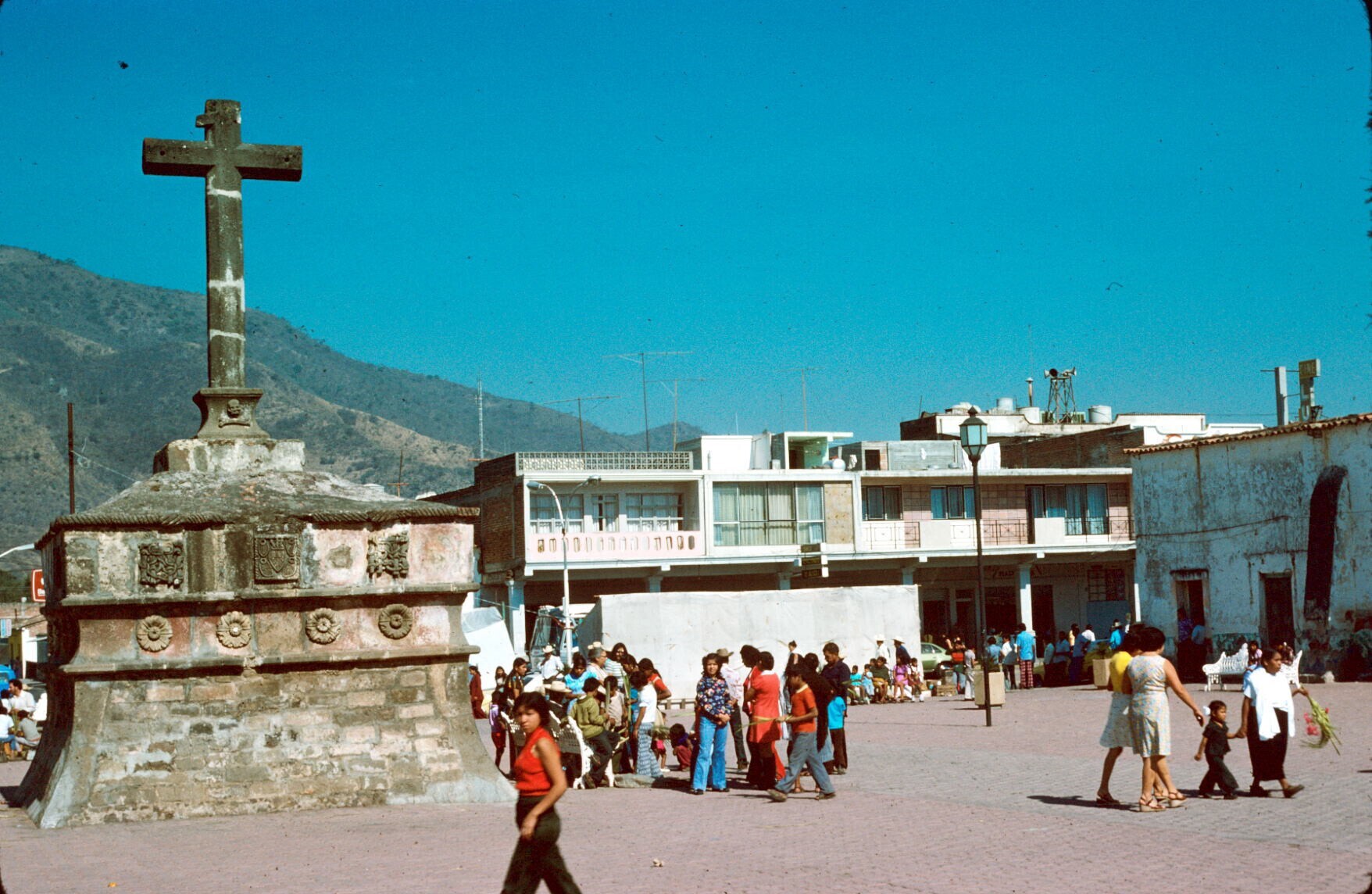 plein voor kerk: vrouw met rebozo, man met jorongo (...