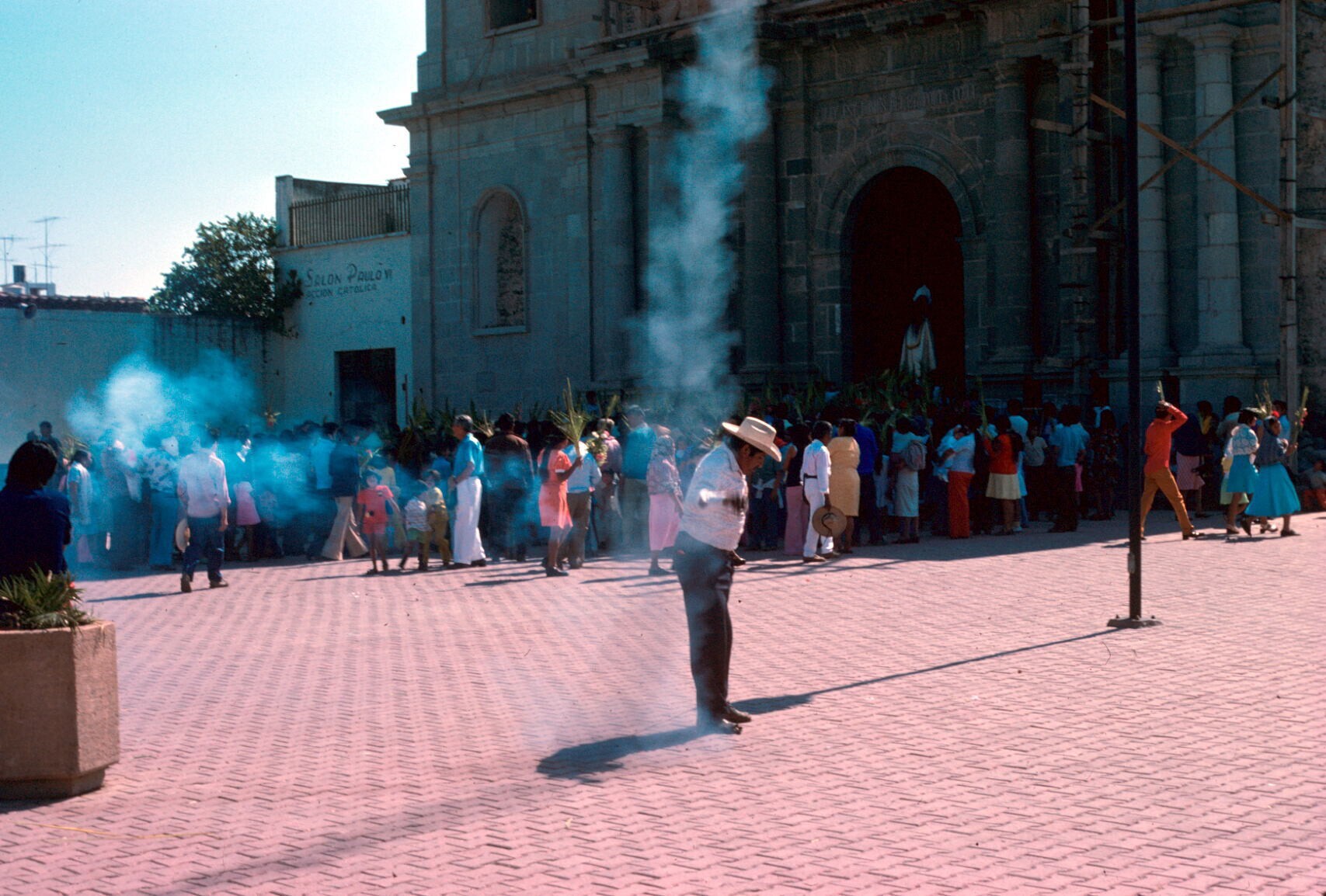 processie met palmtakken bij kerk, met rokend vuurwerk