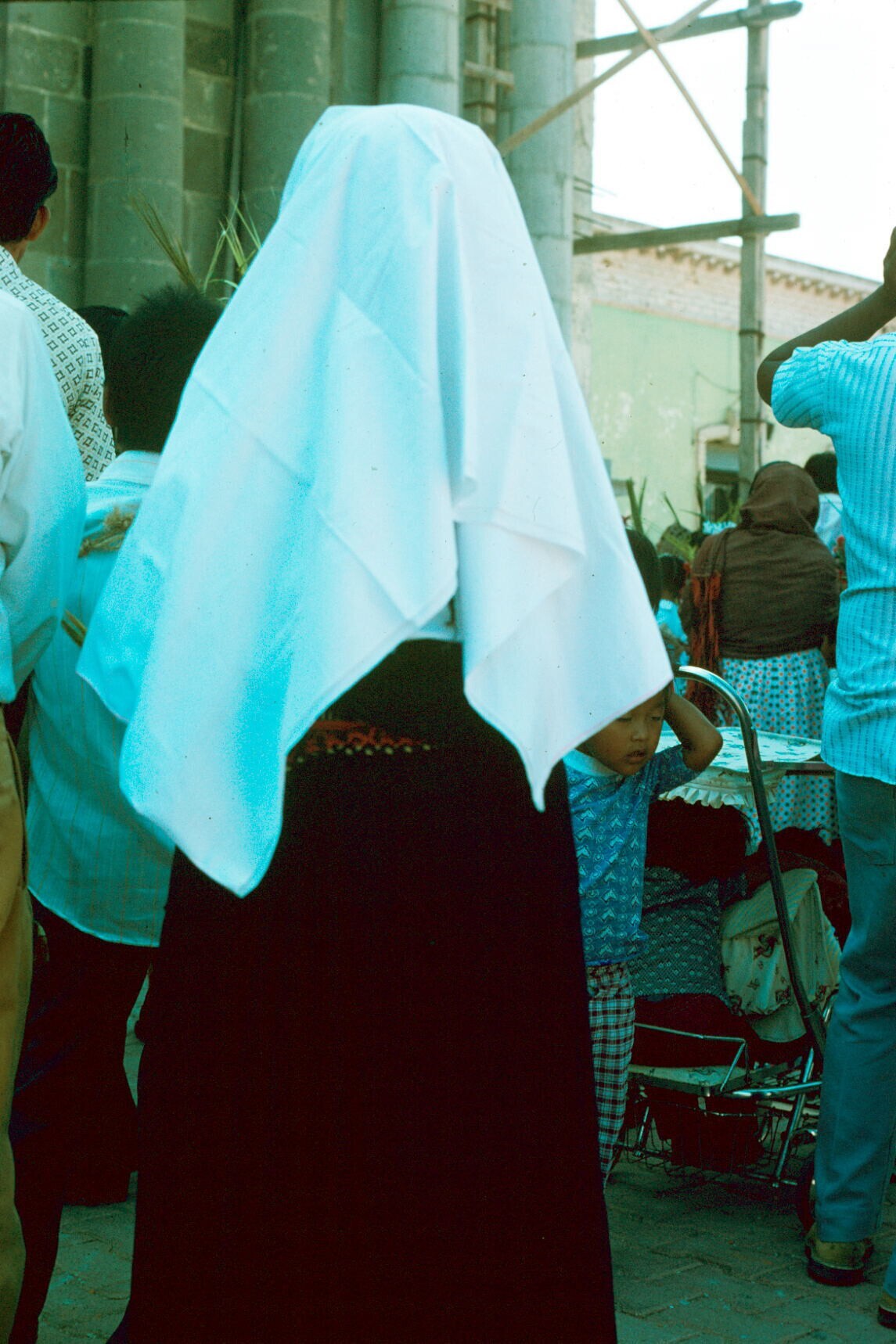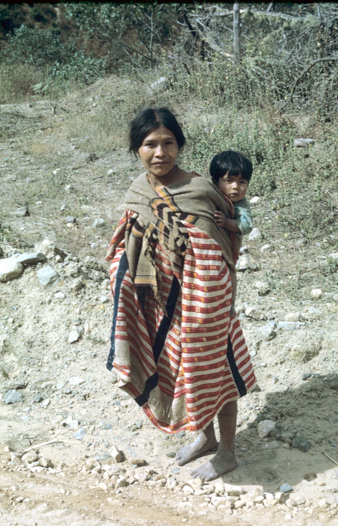 vrouw met rebozo (omslagdoek) op hoofd, op rug gezie...