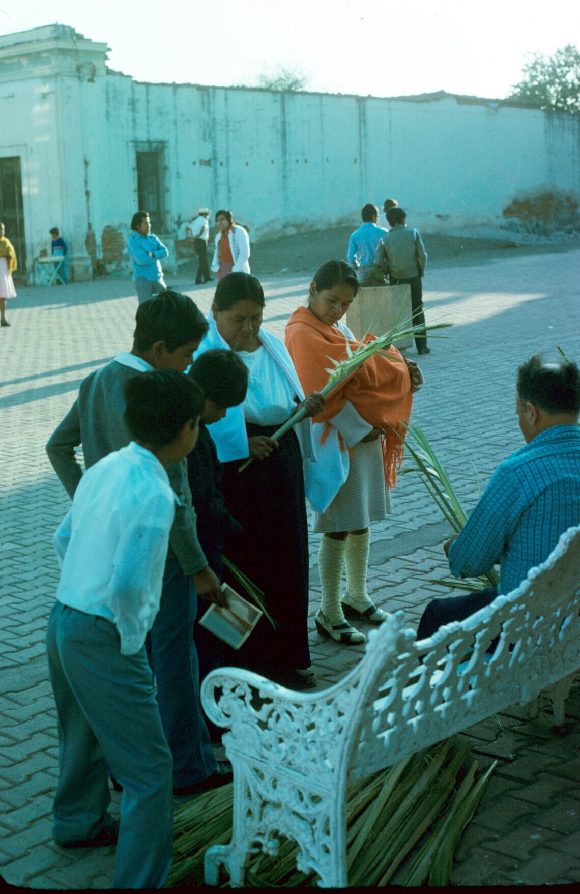 groepje met palmtakken voor Palmzondag op plein bij ...