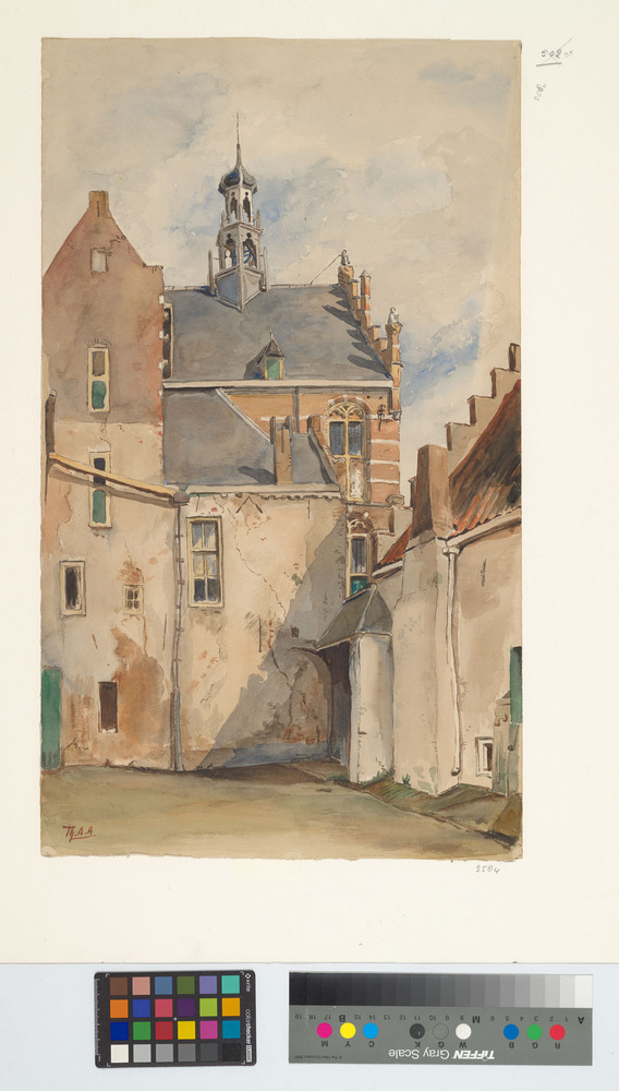 Aquarel, voorstellend een zijaanzicht met binnenplaa...