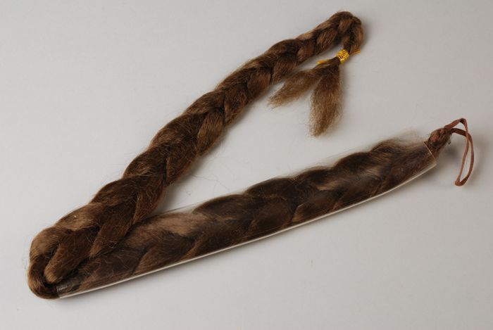Twee losse haarvlechten van echt mensenhaar (A-B), i...