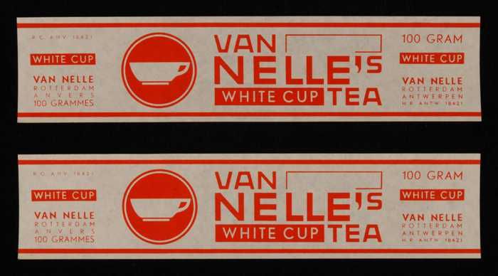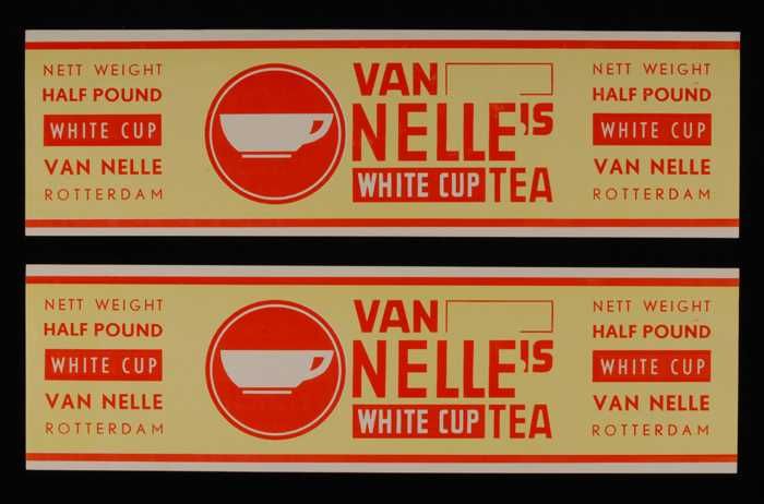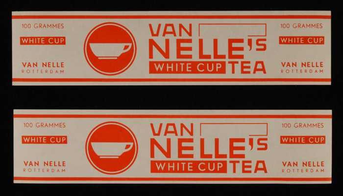 Twee witte, papieren labels VAN NELLE'S WHITE CUP TH...