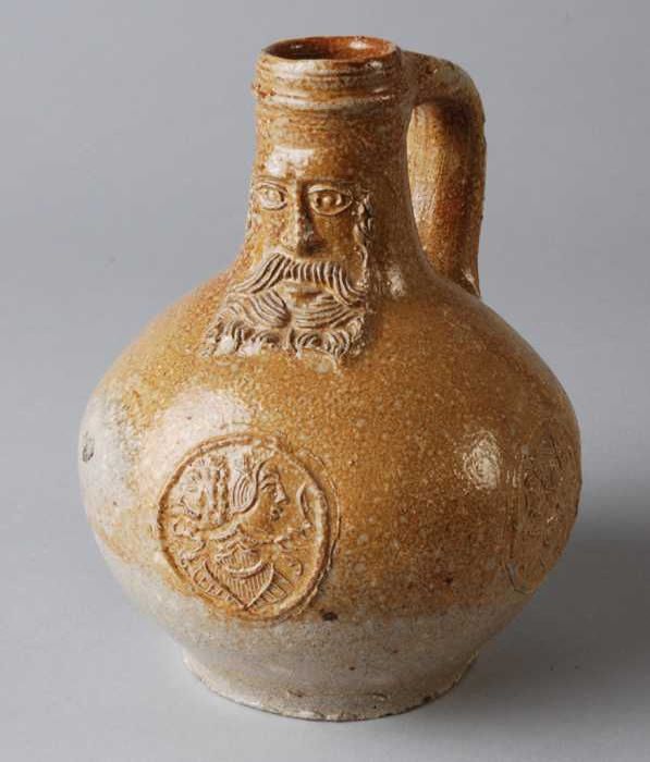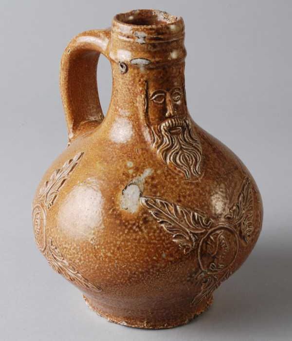 Kleine steengoed kruik op standvlak, gedrongen buik ...