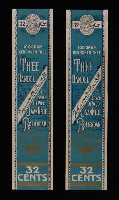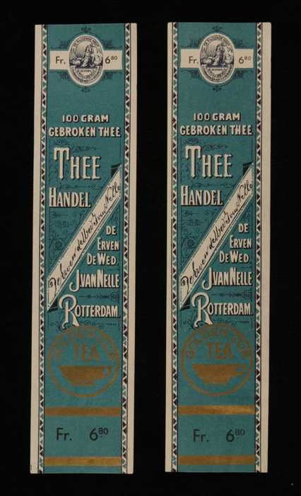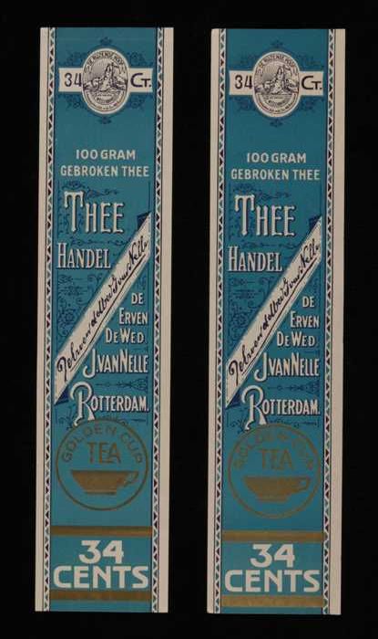 Twee blauwe labels VAN NELLE'S SILVER CUP THEE, Enge...