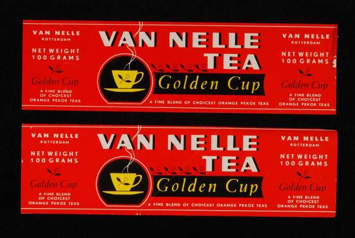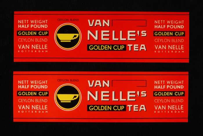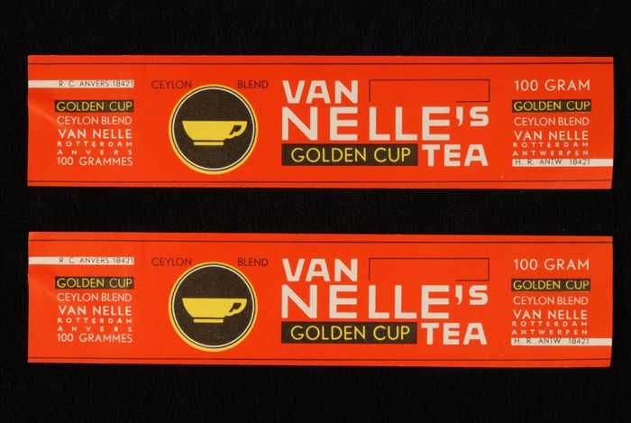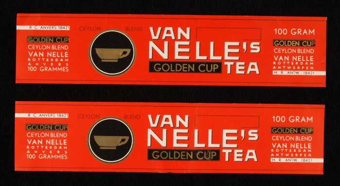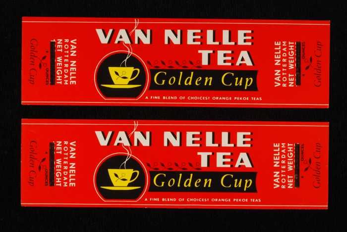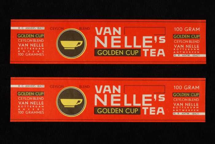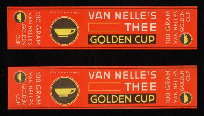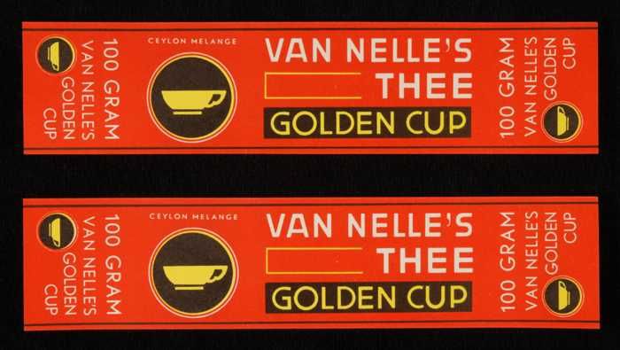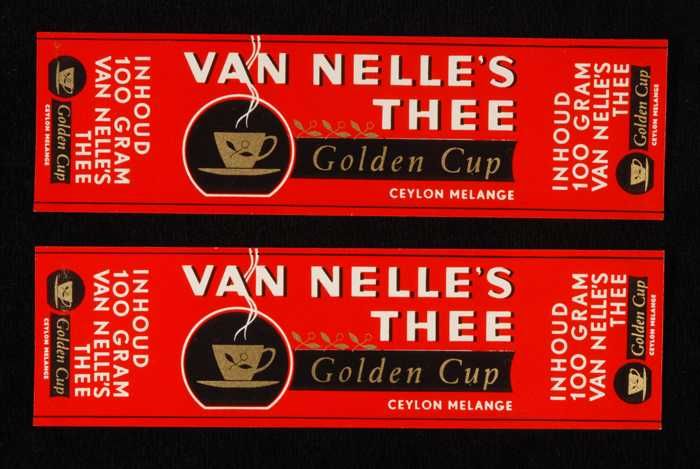 Twee rode, papieren labels VAN NELLE'S GOLDEN CUP TH...