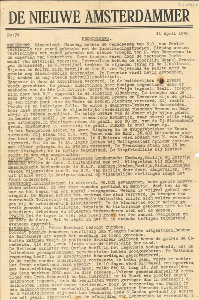 De Nieuwe Amsterdammer ( omslag ) No 74, 11 April 1945