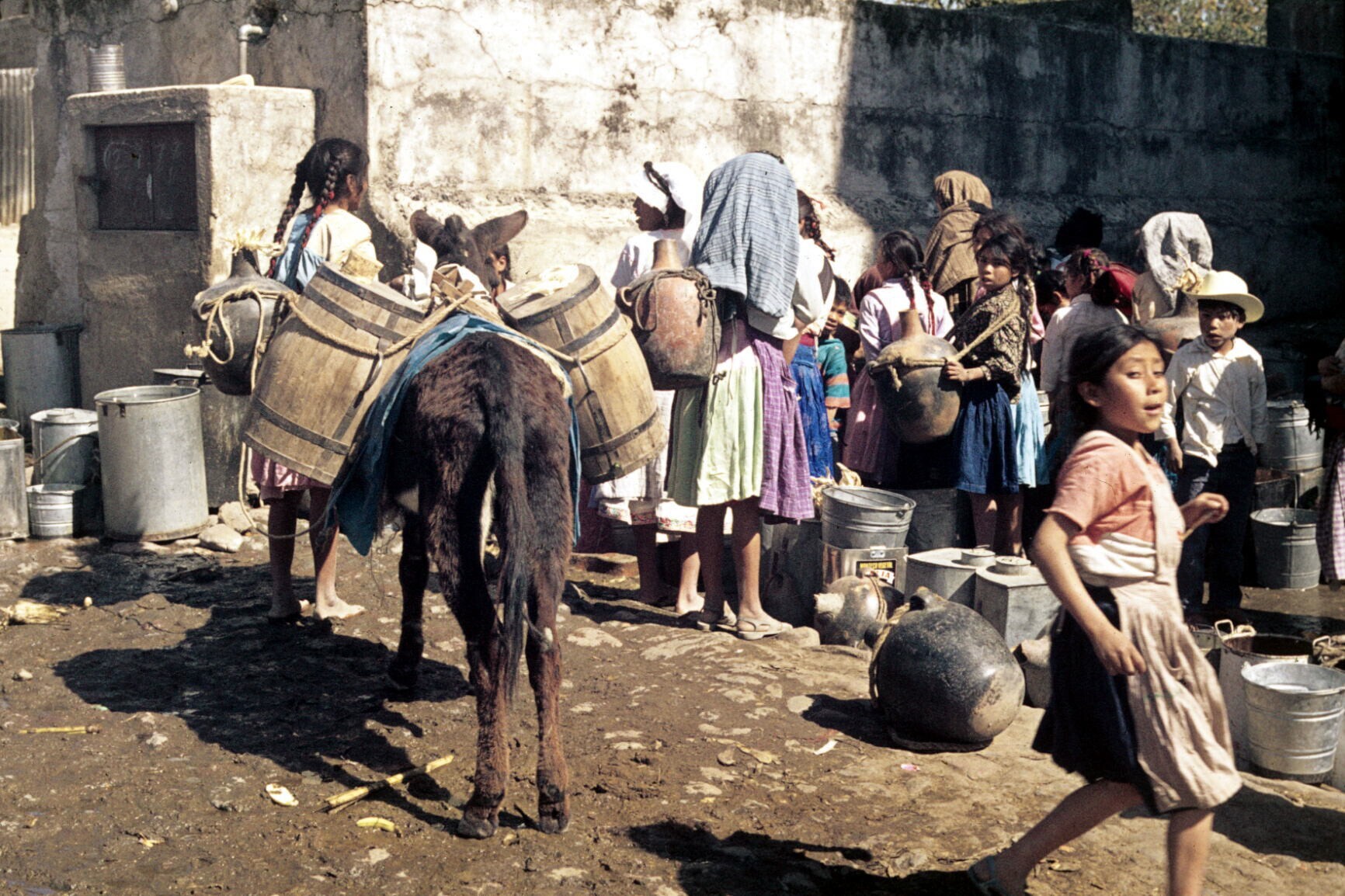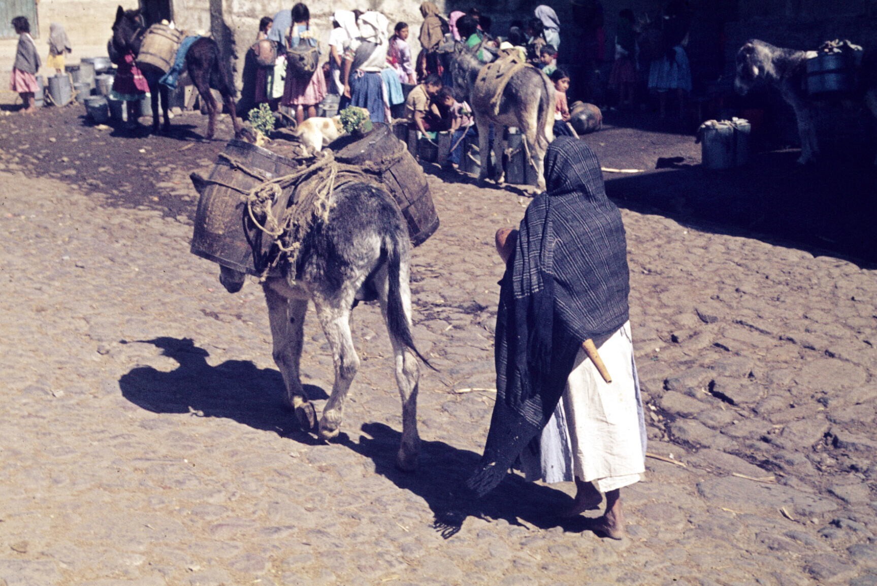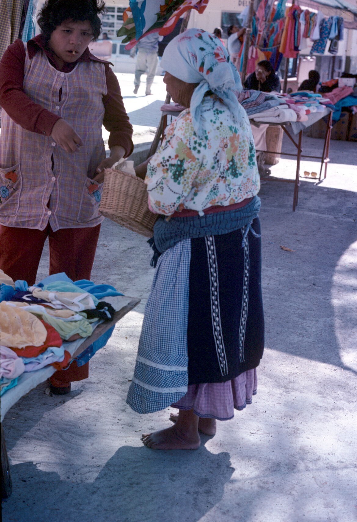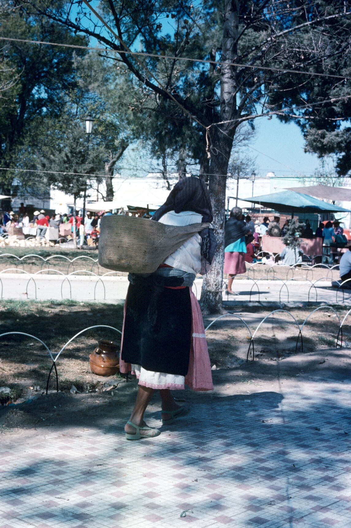 vrouw, canasta (mand met mecapal op rug dragend, bij...
