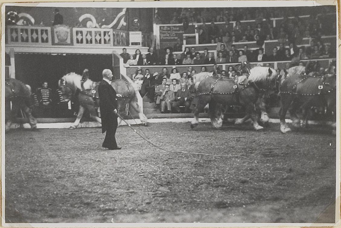Karl Strassburger met paarden in de piste. Uit album...