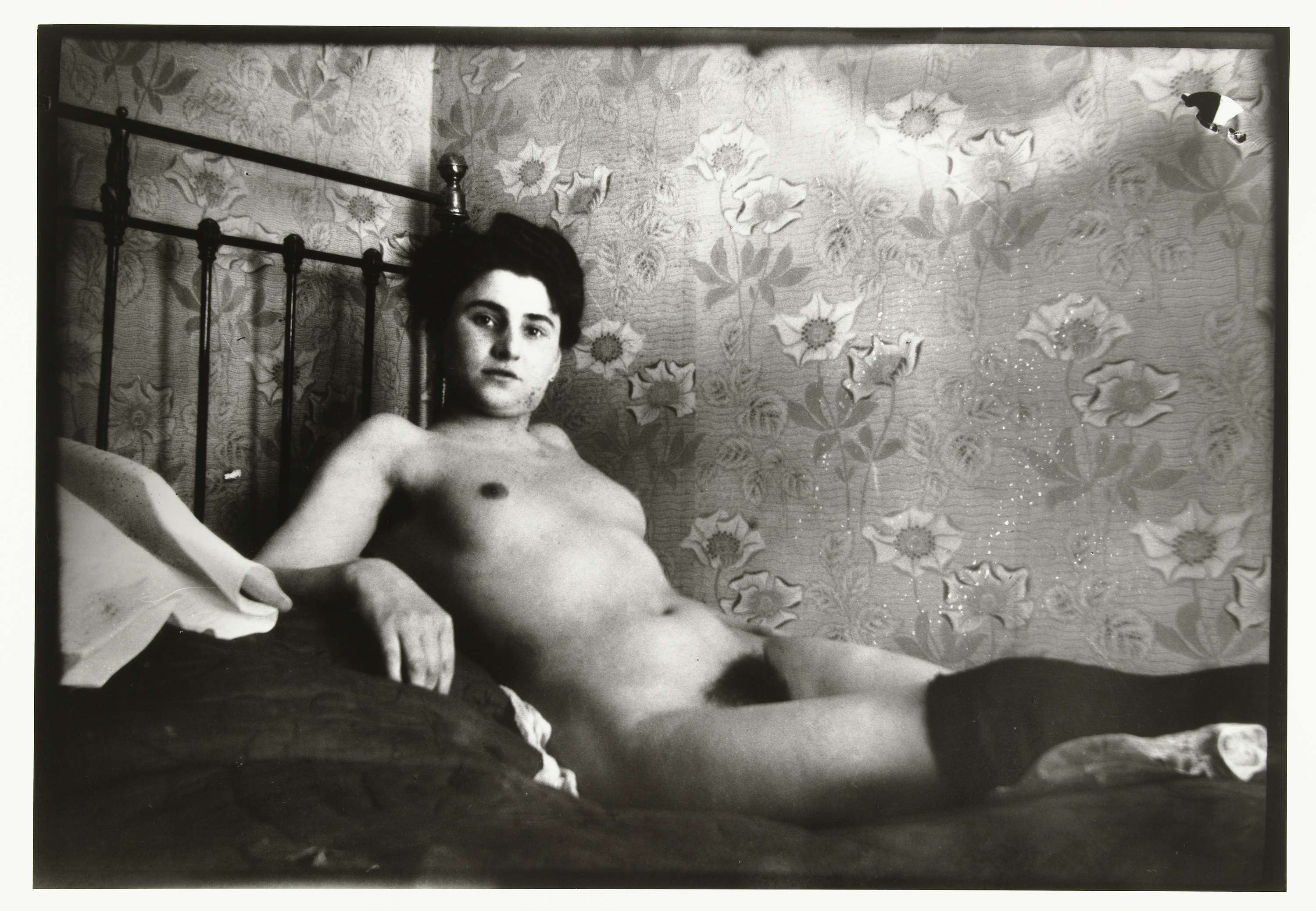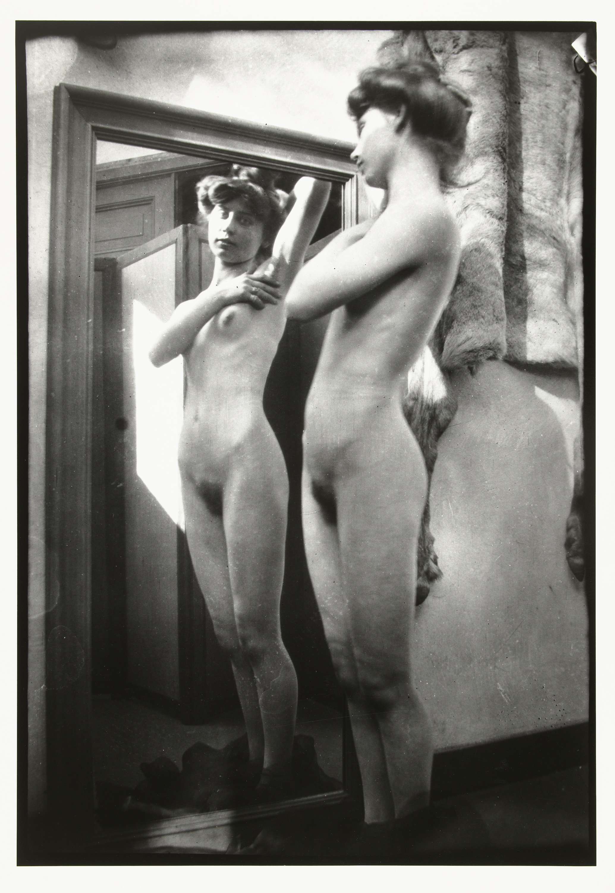 Portret van een vrouwelijk naakt met in de spiegel d...