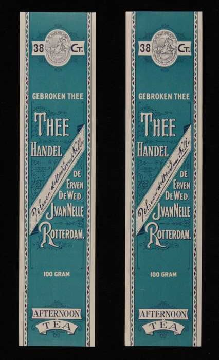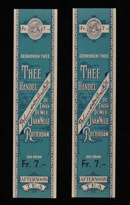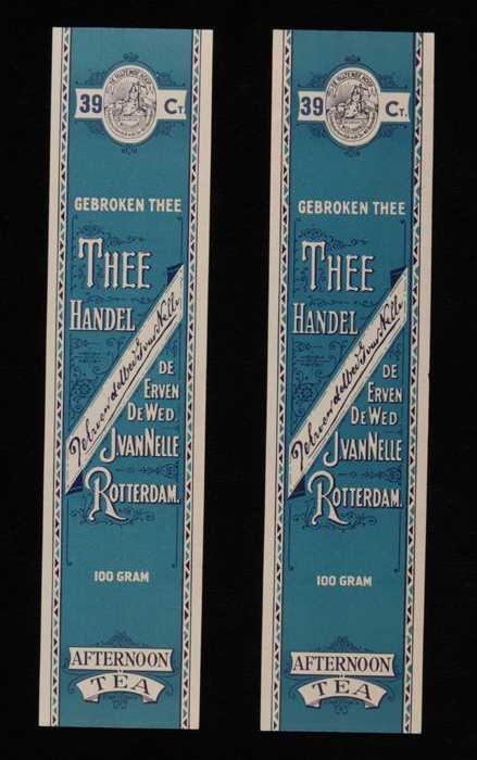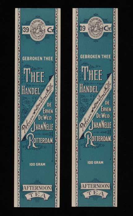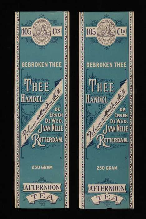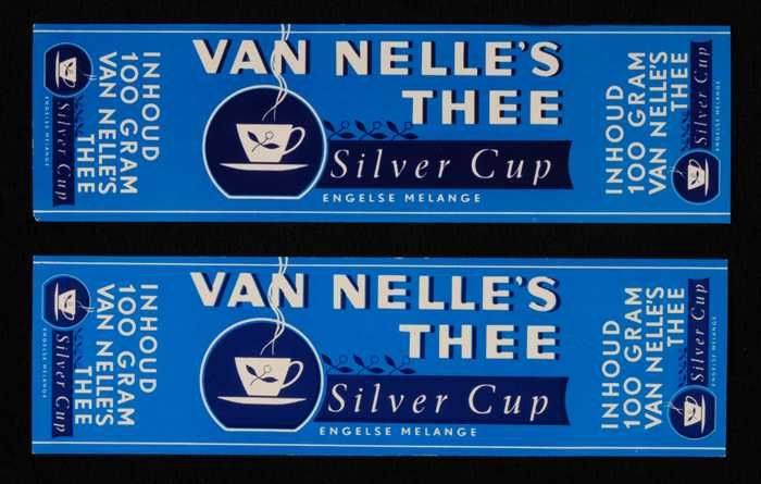 Twee blauwe labels VAN NELLE'S SILVER CUP THEE, Enge...