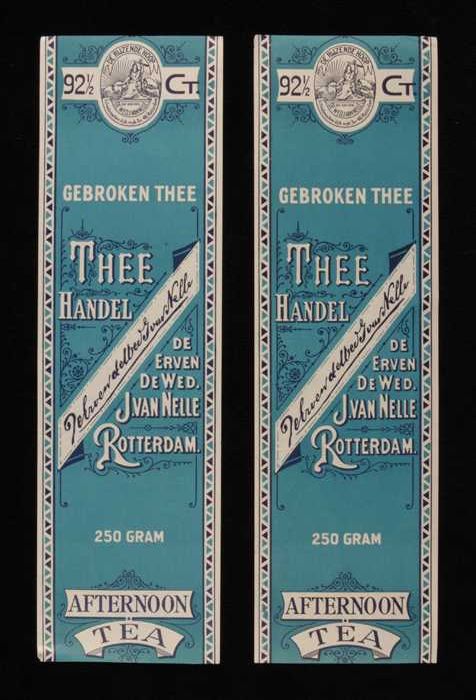 Twee blauw-grijze labels VAN NELLE'S AFTERNOON THEE,...