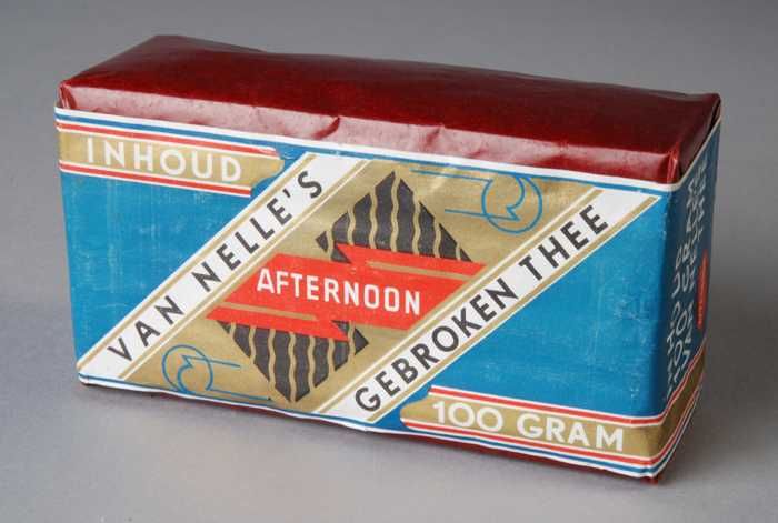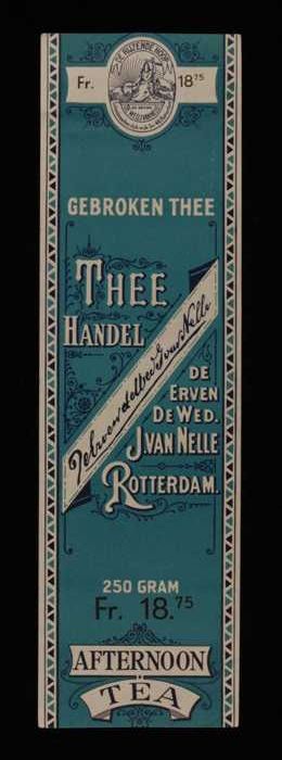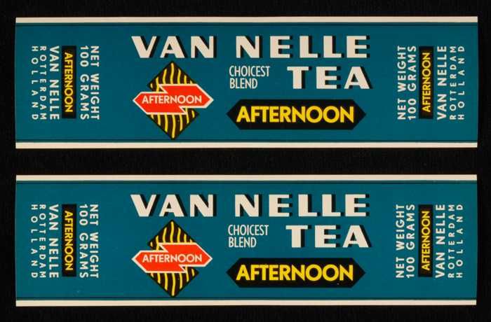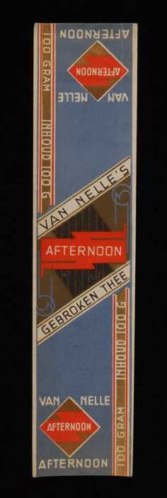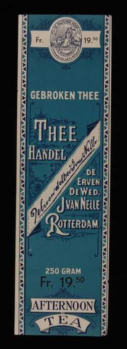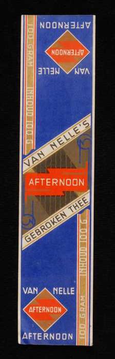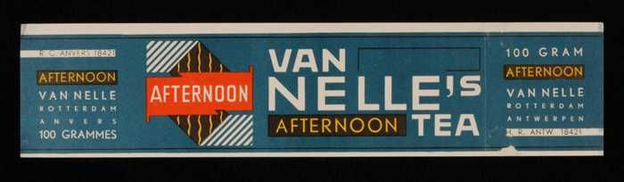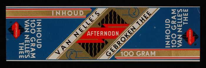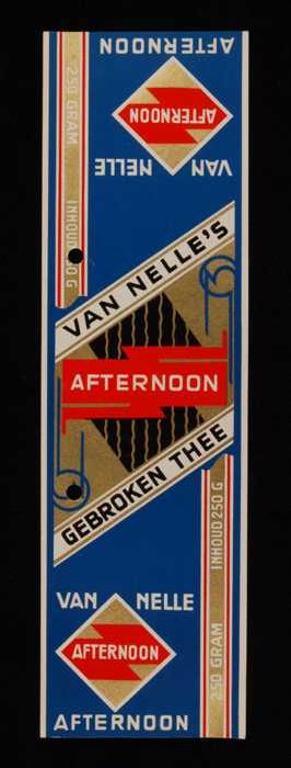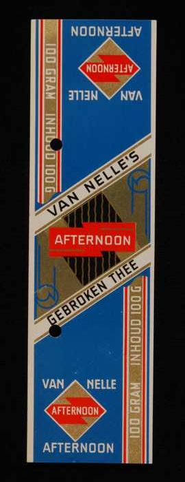 Blauw, papieren label VAN NELLE AFTERNOON THEE, blad...
