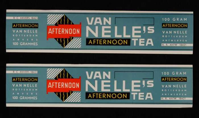 Twee grijs-blauwe labels VAN NELLE AFTERNOON THEE, 1...
