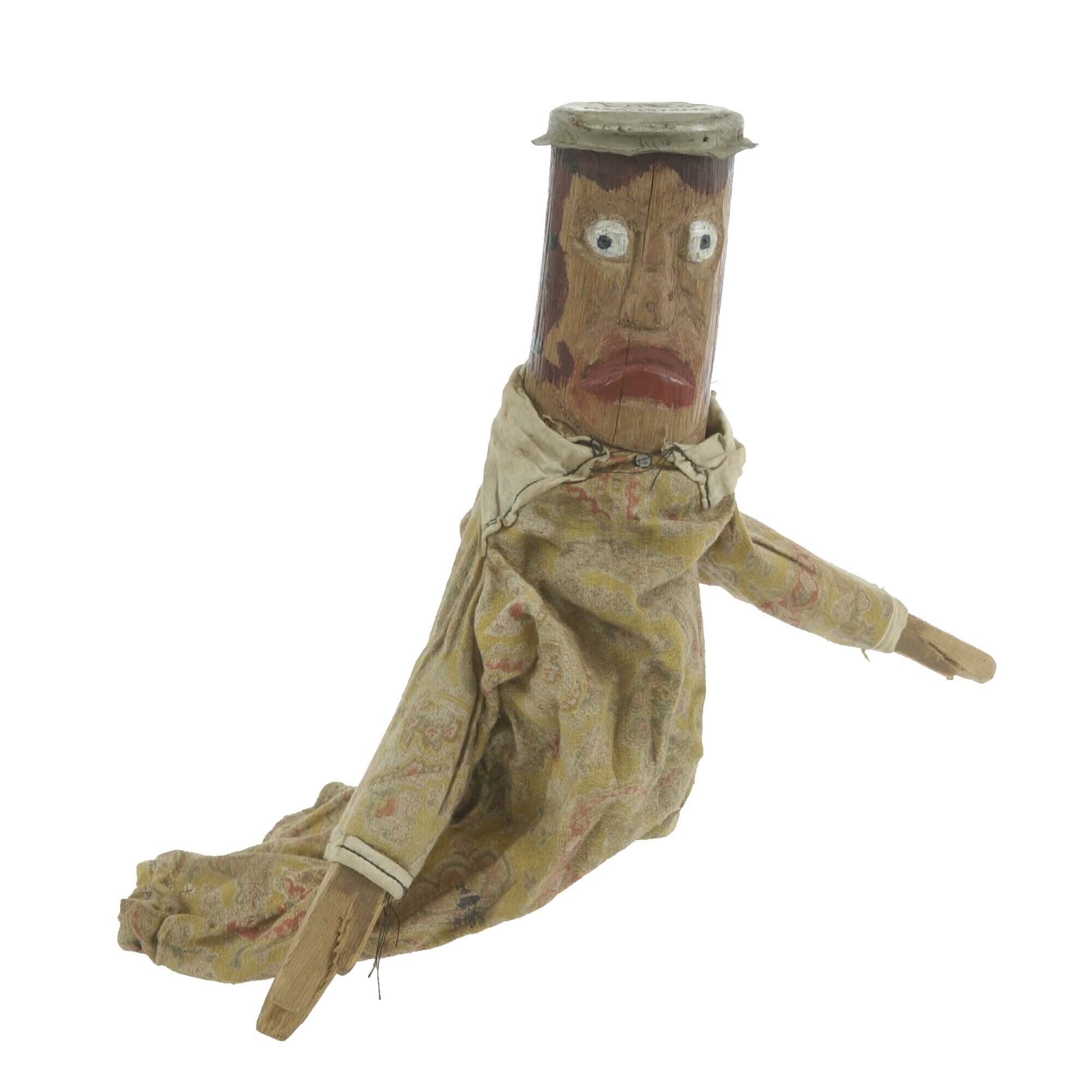 Pop met houten hoofd houten handen en katoenen kleed...