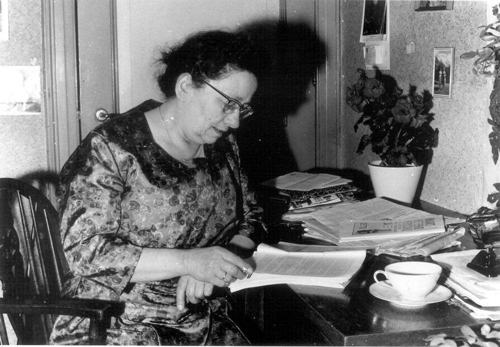 Mevr Bleumer-Voss bij haar platglas in de Bredestraat