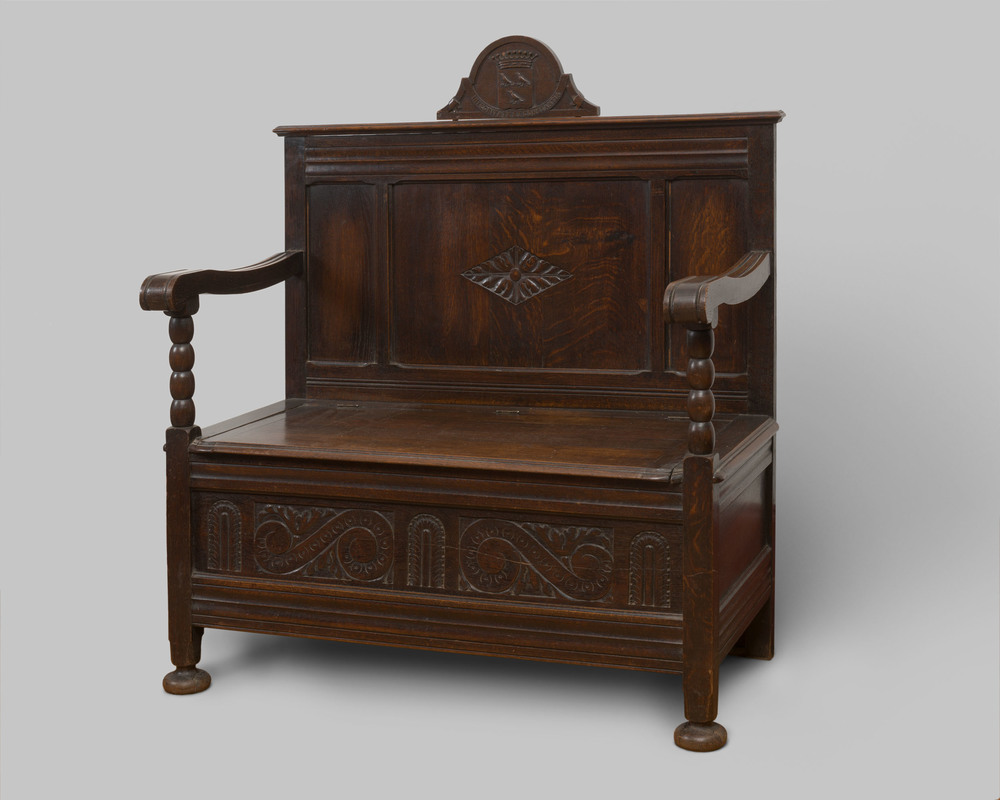 Eikenhouten bank met het familiewapen van Van der Bo...