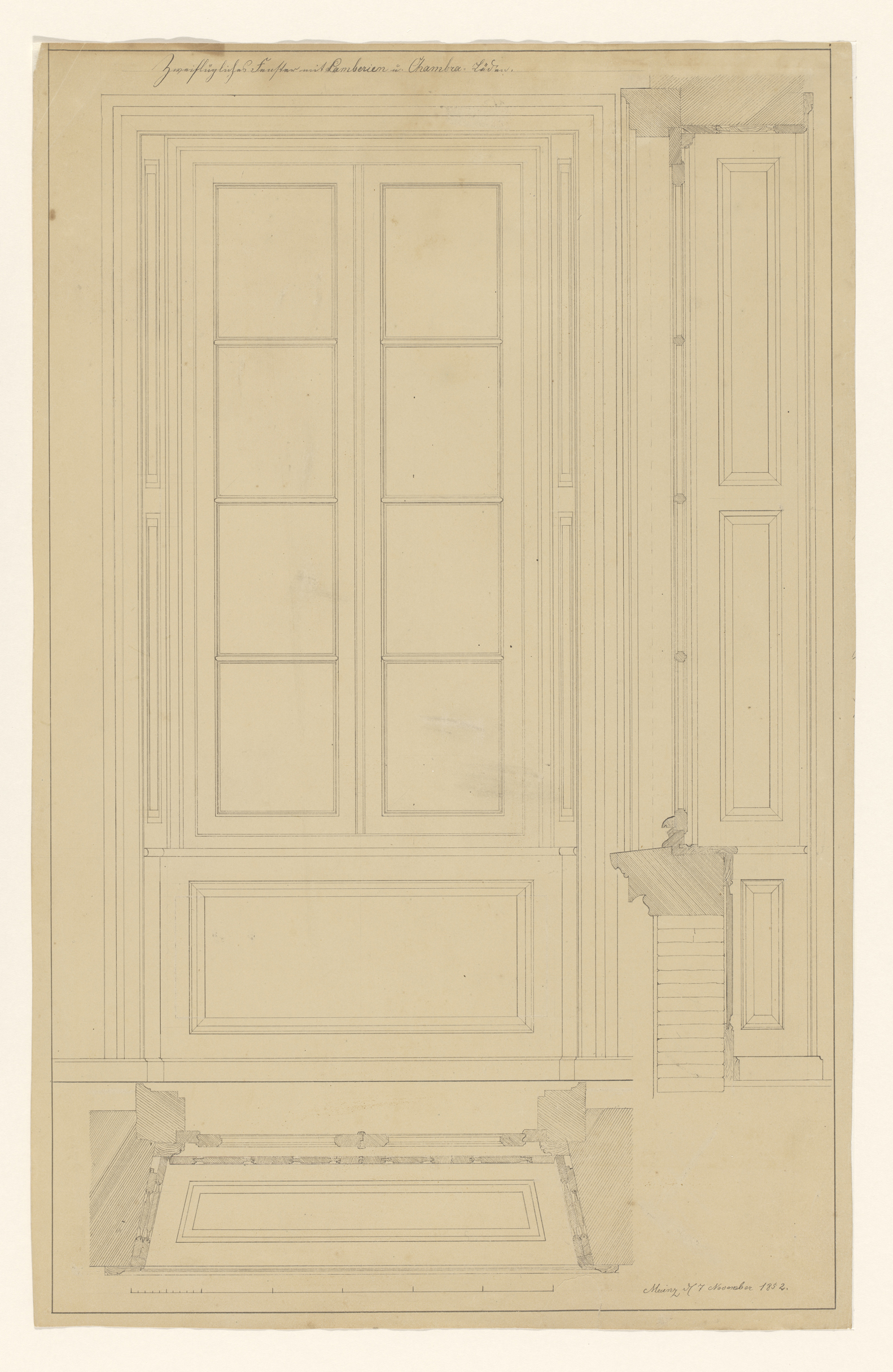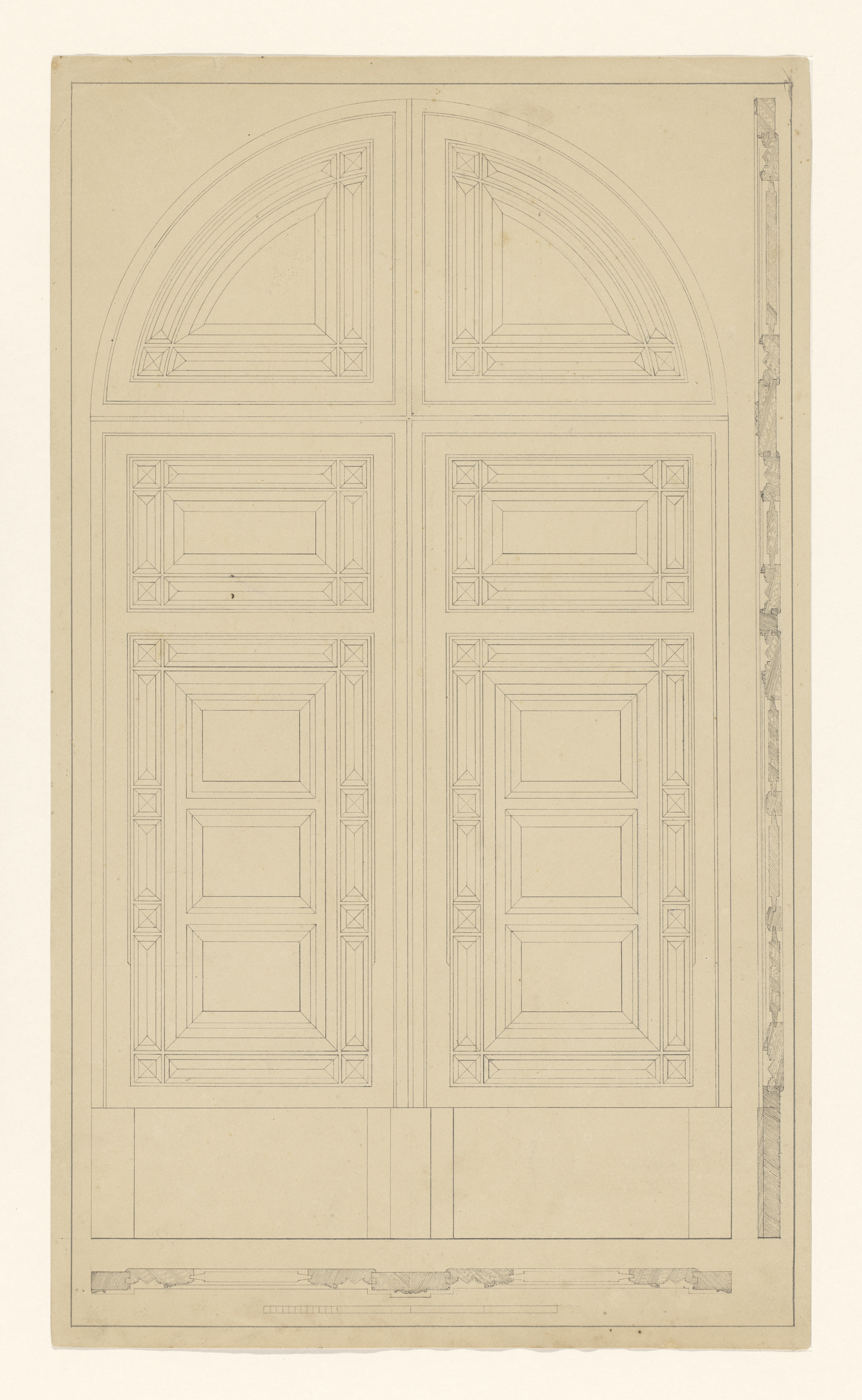 Ontwerp voor een dubbele deur, met zijaanzicht en pl...