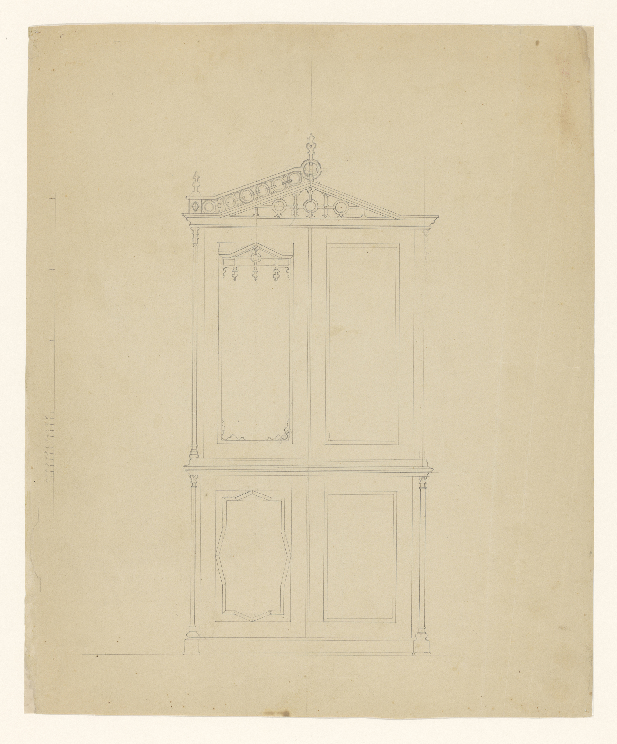 Ontwerp voor een schrijfmeubel met boekenkast en voo...