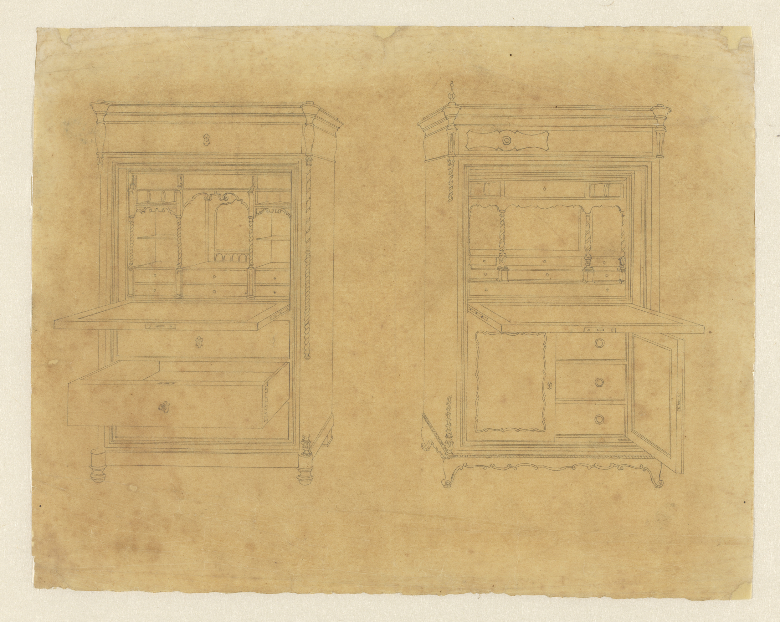 Ontwerp voor een schrijfdoos, voor- en bovenaanzicht...