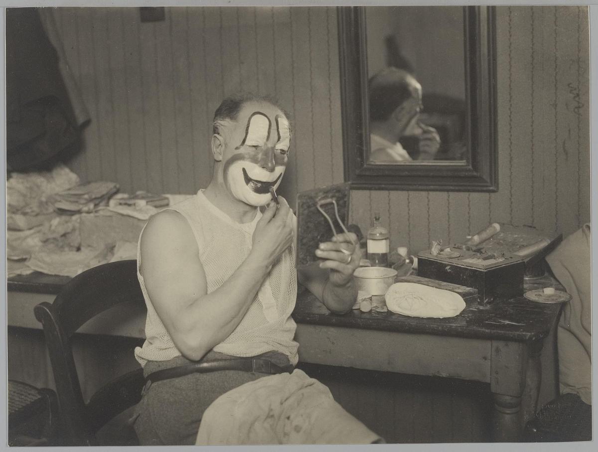 Clown Albert Fratellini schminkt zich in de kleedkamer