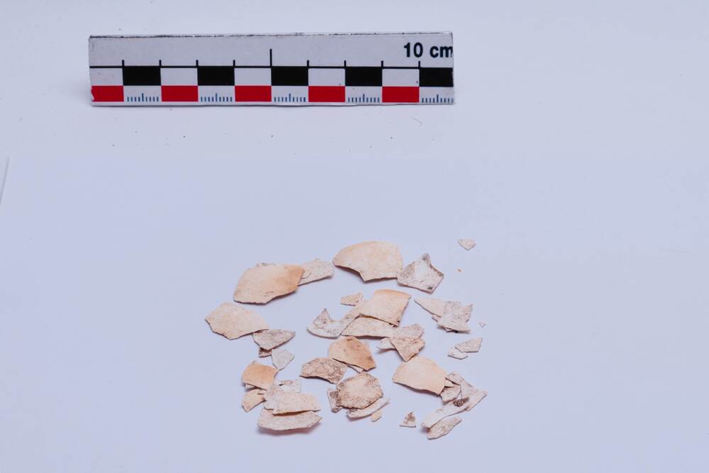 Fragmenten, leer/ijzer/schelp/schaal/pijpaarde,