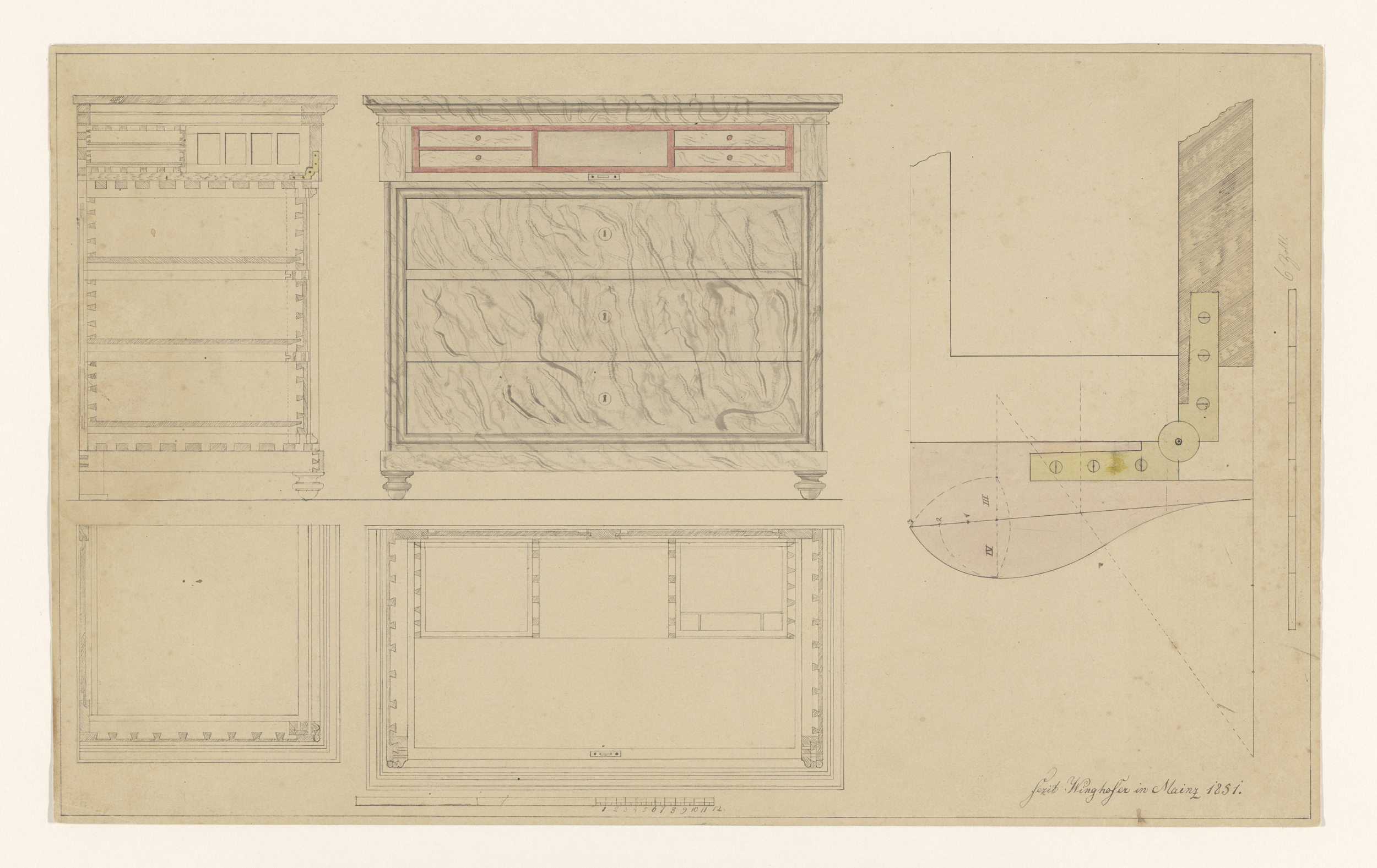 Ontwerp voor een commode met zijaanzicht, een tweede...