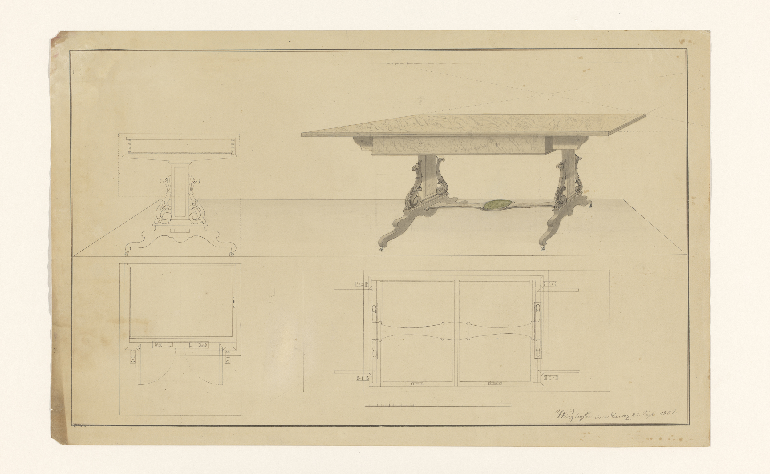 Ontwerp voor een secretaire, zij-, driekwart en fron...