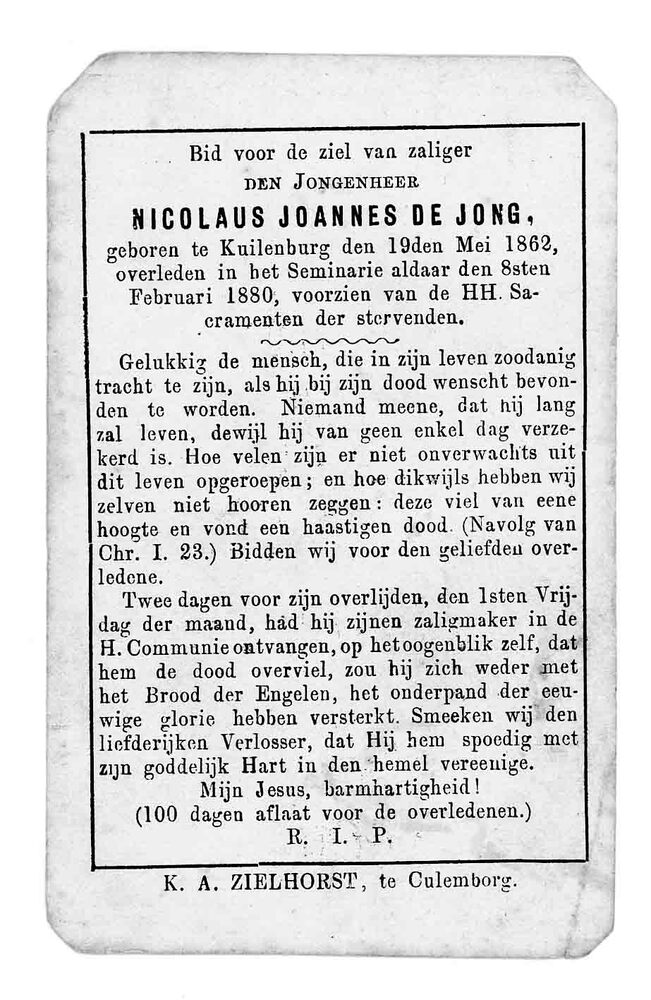bidprent voor Nicolaus Joannes de Jong. Geboren 19-0...
