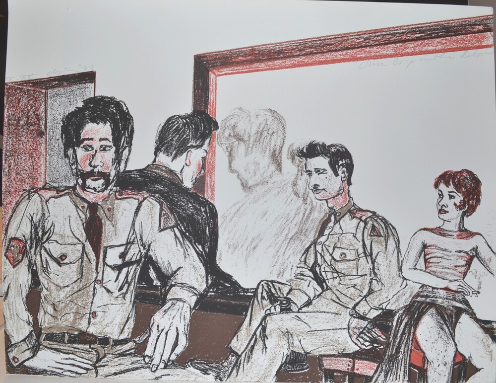 Zeefdruk op papier met de titel 'Our Boys in the Leb...