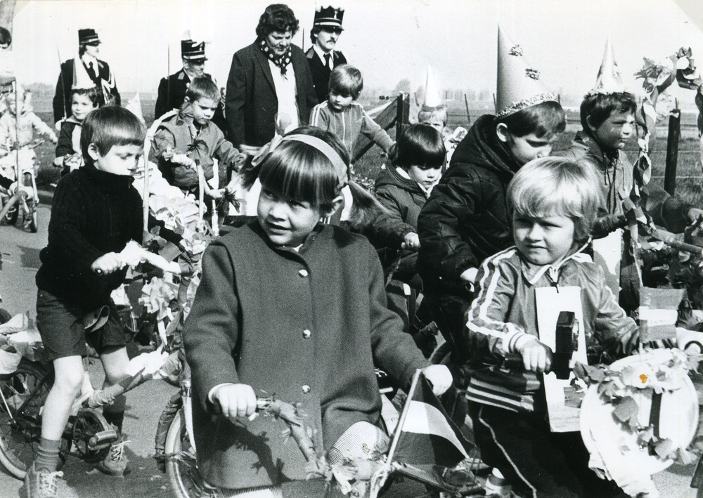 Zwart-wit foto van een kinderoptocht naar een nieuw ...