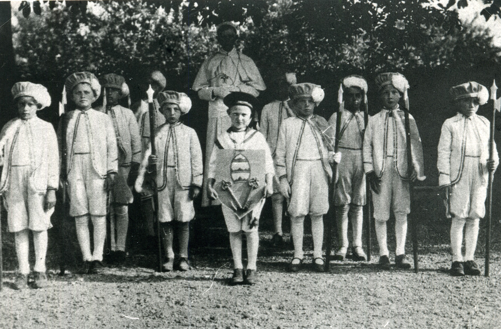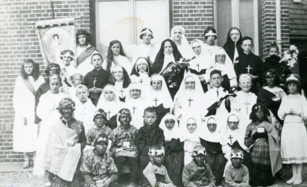 Zwart-wit foto van de kindsheidprocessie in Herwen c...